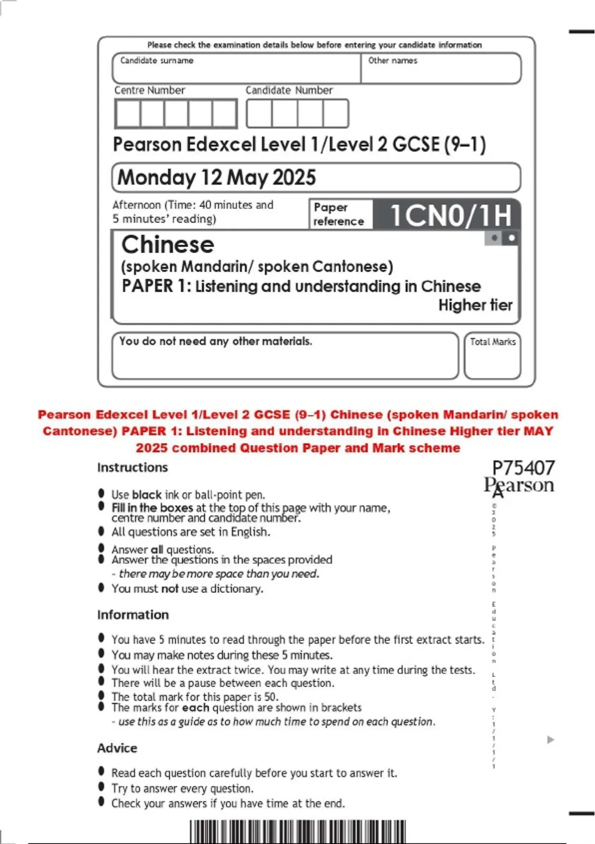Pearson Edexcel Level 1/Level 2 GCSE (9–1) Chinese (spoken Mandarin/ spoken Cantonese) PAPER 1: Listening and understanding in Chinese Higher tier MAY 2025 combined Question Paper and Mark scheme