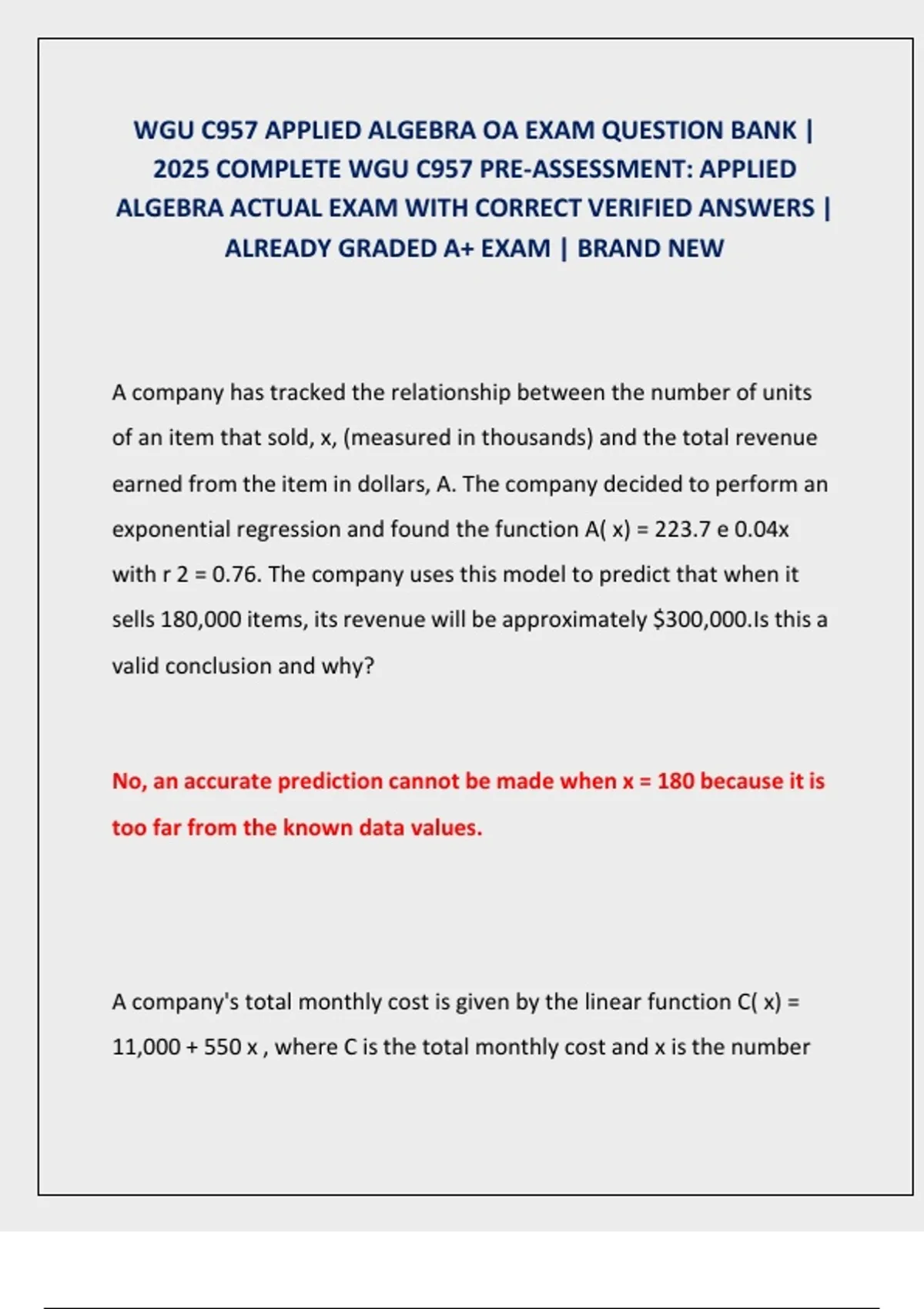 ALGEBRA ACTUAL EXAM WITH CORRECT VERIFIED ANSWERS |