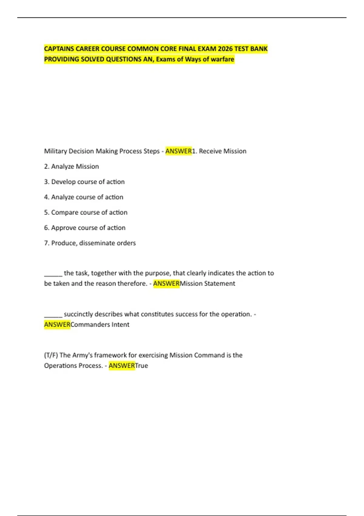CAPTAINS CAREER COURSE COMMON CORE FINAL EXAM 2026 TEST BANK