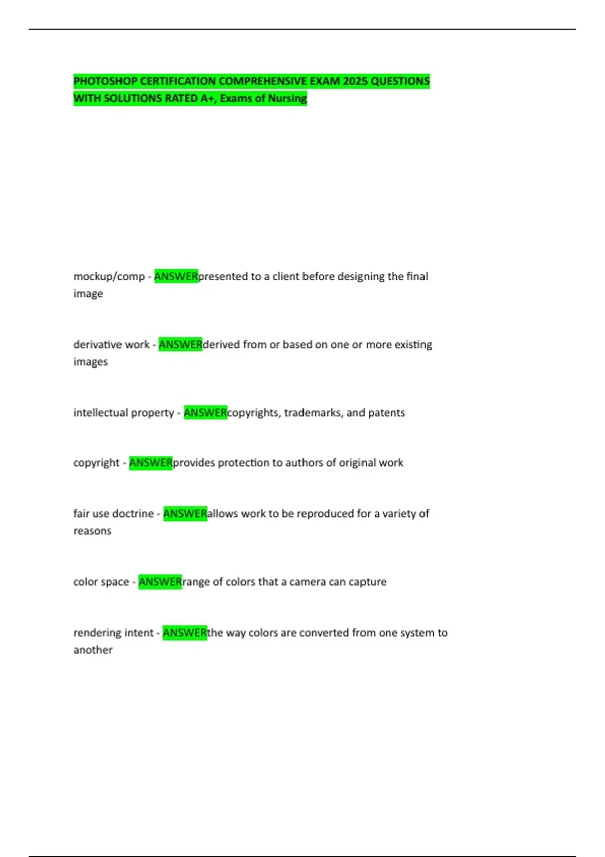 PHOTOSHOP CERTIFICATION COMPREHENSIVE EXAM 2025 QUESTIONS WITH SOLUTIONS RATED A+, Exams of Nursing