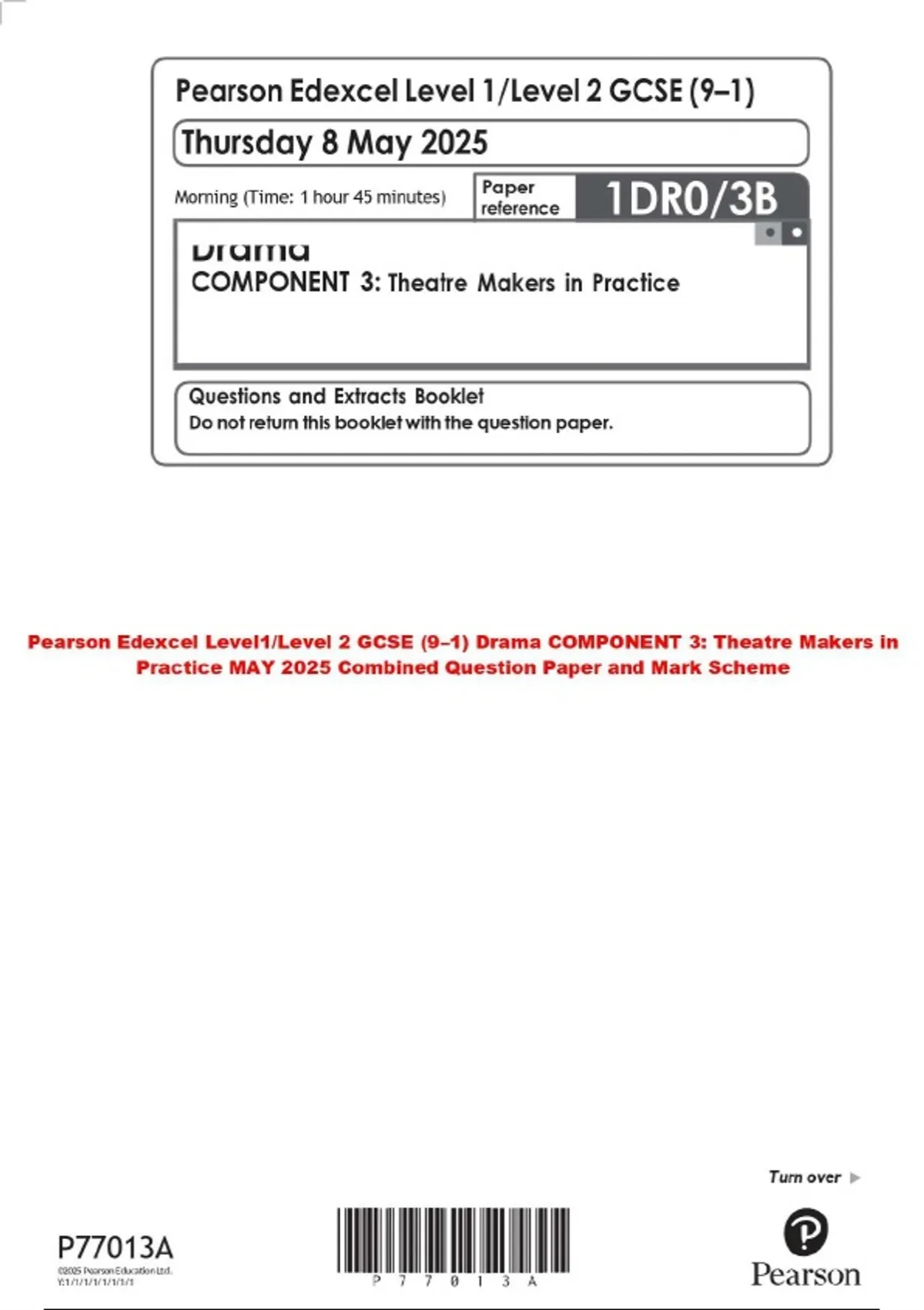 Pearson Edexcel Level1/Level 2 GCSE (9–1) Drama COMPONENT 3: Theatre Makers in Practice MAY 2025 Combined Question Paper and Mark Scheme