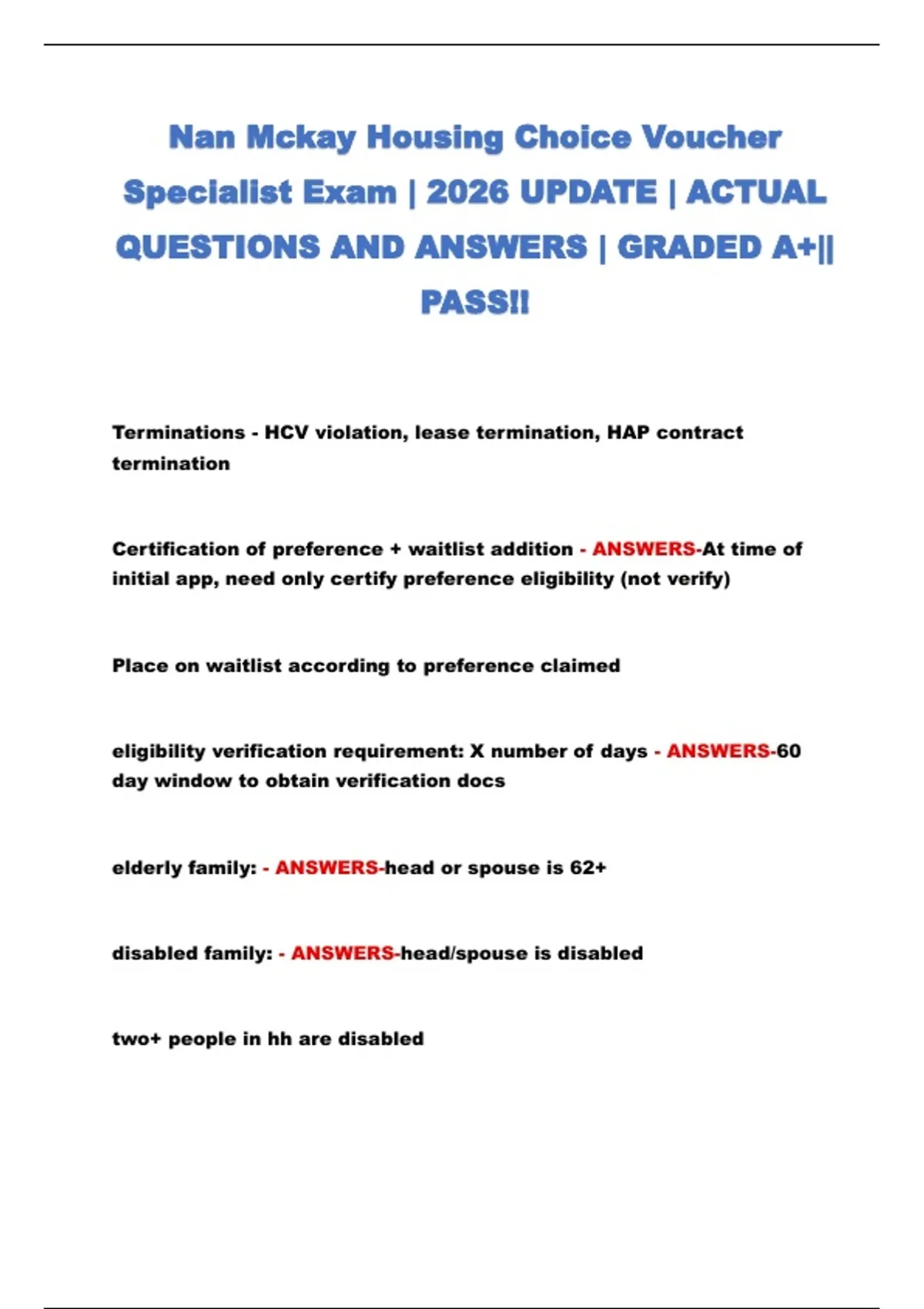 Nan Mckay Housing Choice Voucher Specialist Exam | 2026 UPDATE | ACTUAL QUESTIONS AND ANSWERS | GRADED A+|| PASS!!