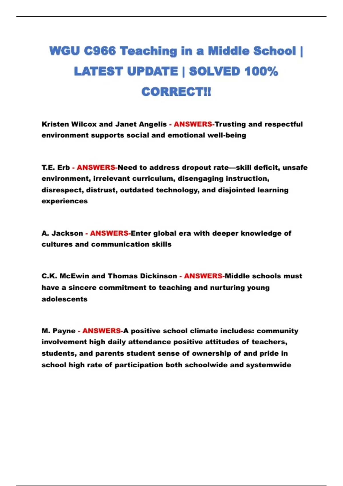 WGU C966 Teaching in a Middle School | Latest Update | Solved Q&A