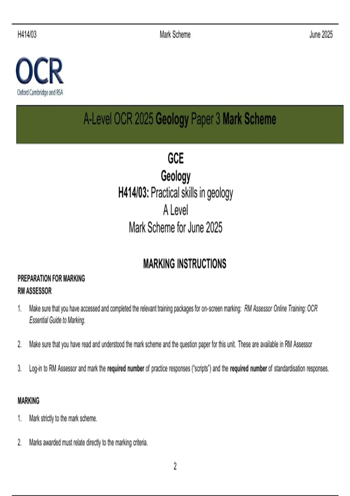 A-Level OCR 2025 Geology Paper 3 Mark Scheme