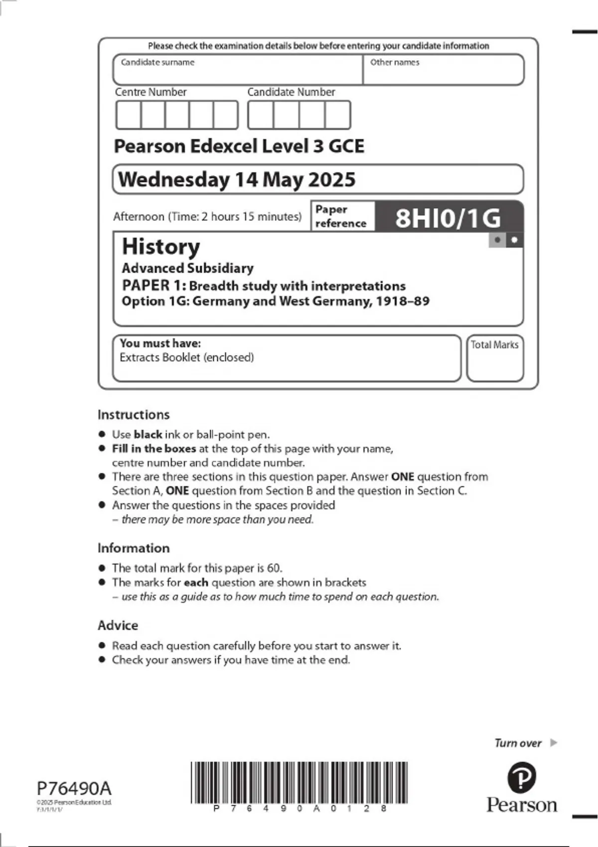 2025 Pearson Edexcel Level 3 GCE 8HI0/1G History Advanced Subsidiary PAPER 1: Breadth study with interpretations Option 1G: Germany and West Germany, 1918–89