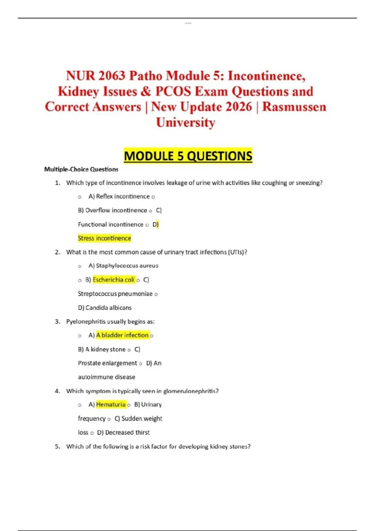 NUR 2063 Patho Module 5: Incontinence, Kidney Issues & PCOS Exam Questions and Correct Answers | New Update 2026 | Rasmussen University