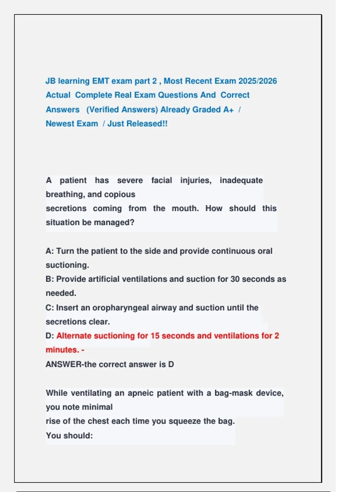 JB learning EMT exam part 2 , Most Recent Exam 2025/2026 Actual Complete Real Exam Questions And Correct Answers (Verified Answers) Already Graded A+ / Newest Exam / Just Released!! JB learning EMT exam part 2 , Most Recent Exam 2025/2026 Actual Complete Real Exam Questions And Correct Answers (Verified Answers) Already Graded A+ / Newest Exam / Just Released!! JB learning EMT exam part 2 , Most Recent Exam 2025/2026 Actual Complete Real Exam Questions And Correct Answers (Verified Answers) Already Graded A+ / Newest Exam / Just Released!! JB learning EMT exam part 2 , Most Recent Exam 2025/2026 Actual Complete Real Exam Questions And Correct Answers (Verified Answers) Already Graded A+ / Newest Exam / Just Released!!