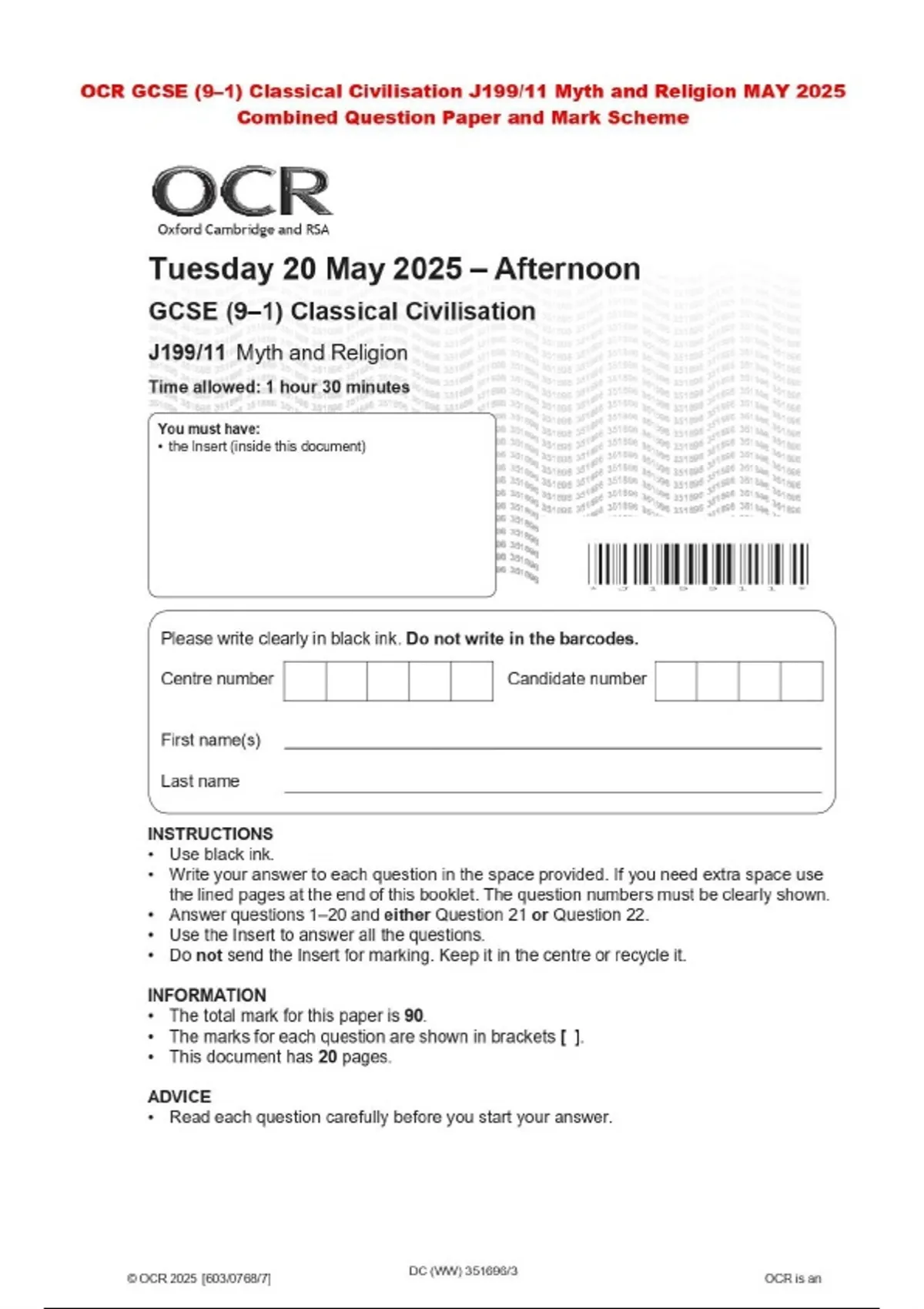OCR GCSE (9–1) Classical Civilisation J199/11 Myth and Religion MAY 2025 Combined Question Paper and Mark Scheme