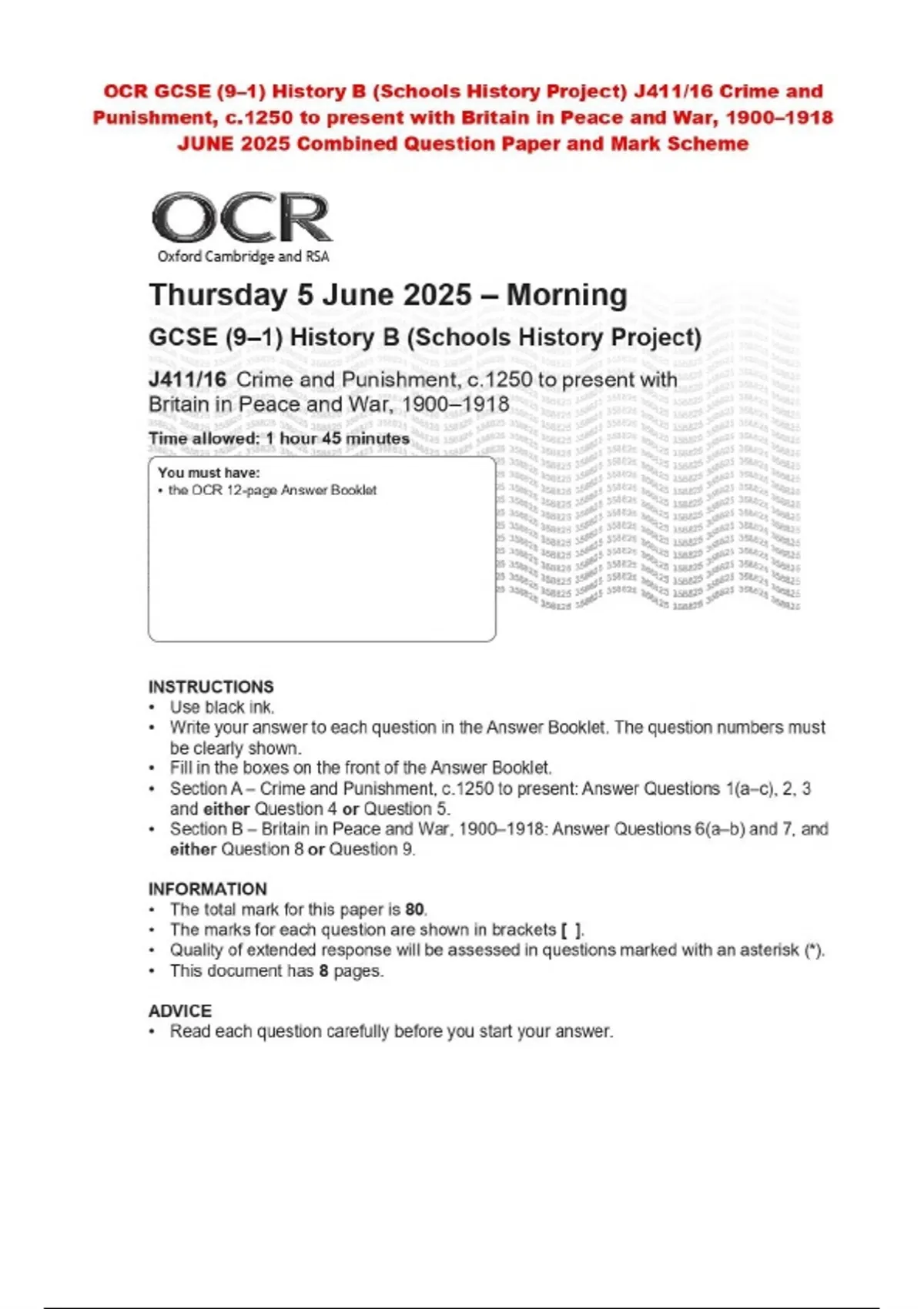 OCR GCSE (9–1) History B (Schools History Project) J411/16 Crime and Punishment, c.1250 to present with Britain in Peace and War, 1900–1918 JUNE 2025 Combined Question Paper and Mark Scheme