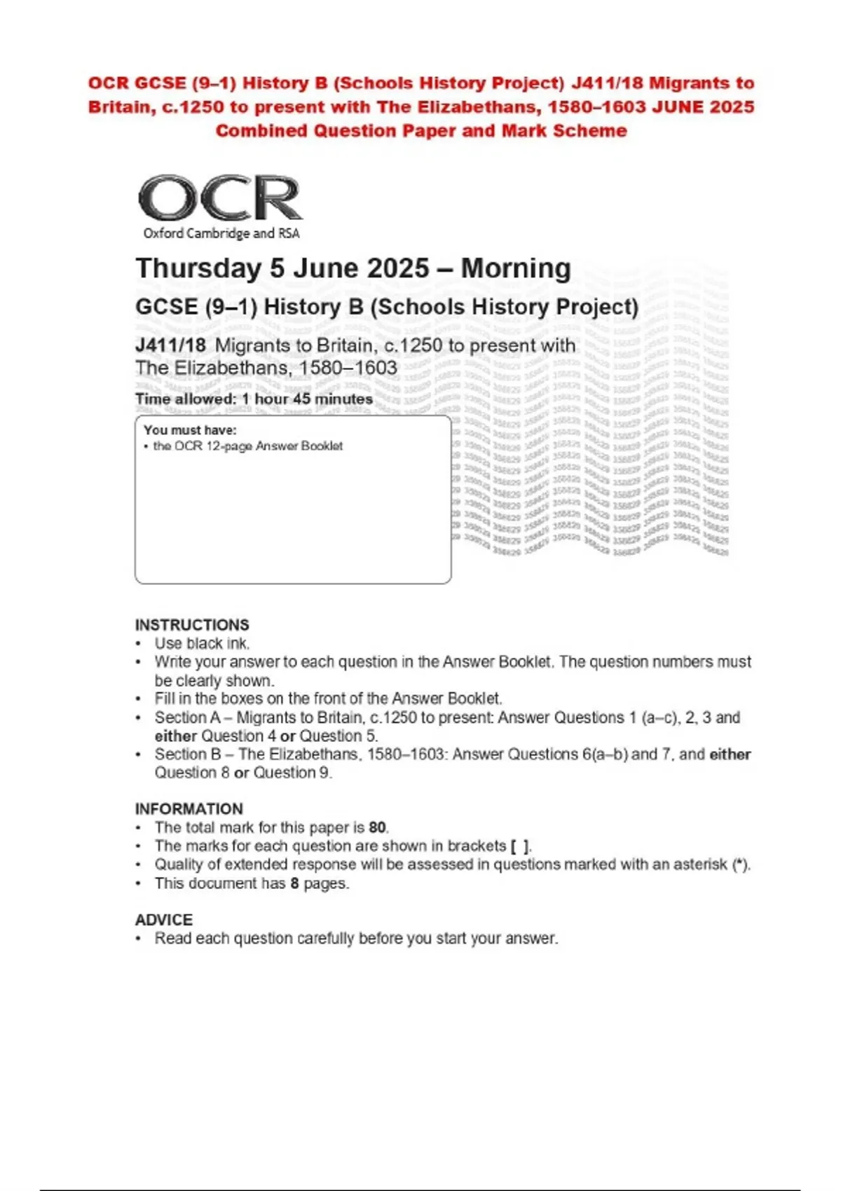 OCR GCSE (9–1) History B (Schools History Project) J411/18 Migrants to Britain, c.1250 to present with The Elizabethans, 1580–1603 JUNE 2025 Combined Question Paper and Mark Scheme