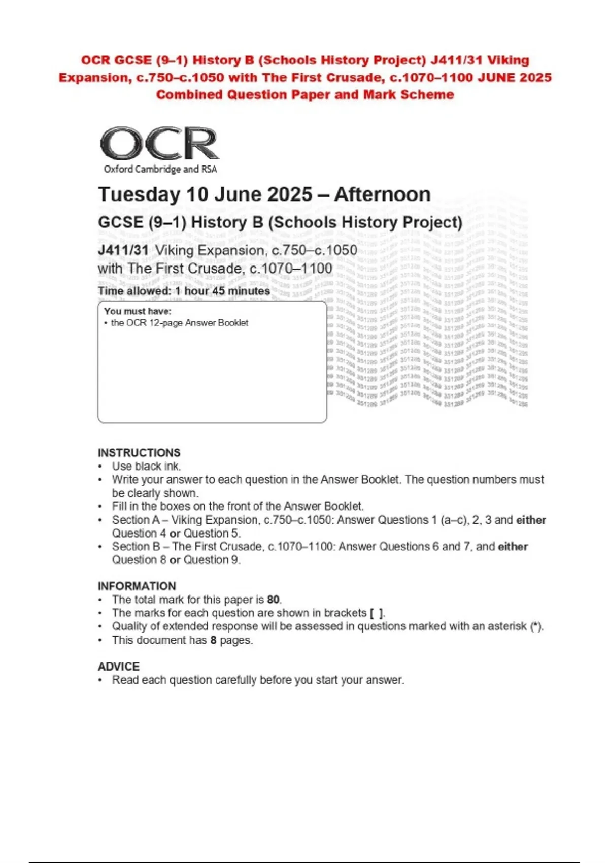 OCR GCSE (9–1) History B (Schools History Project) J411/31 Viking Expansion, c.750–c.1050 with The First Crusade, c.1070–1100 JUNE 2025 Combined Question Paper and Mark Scheme