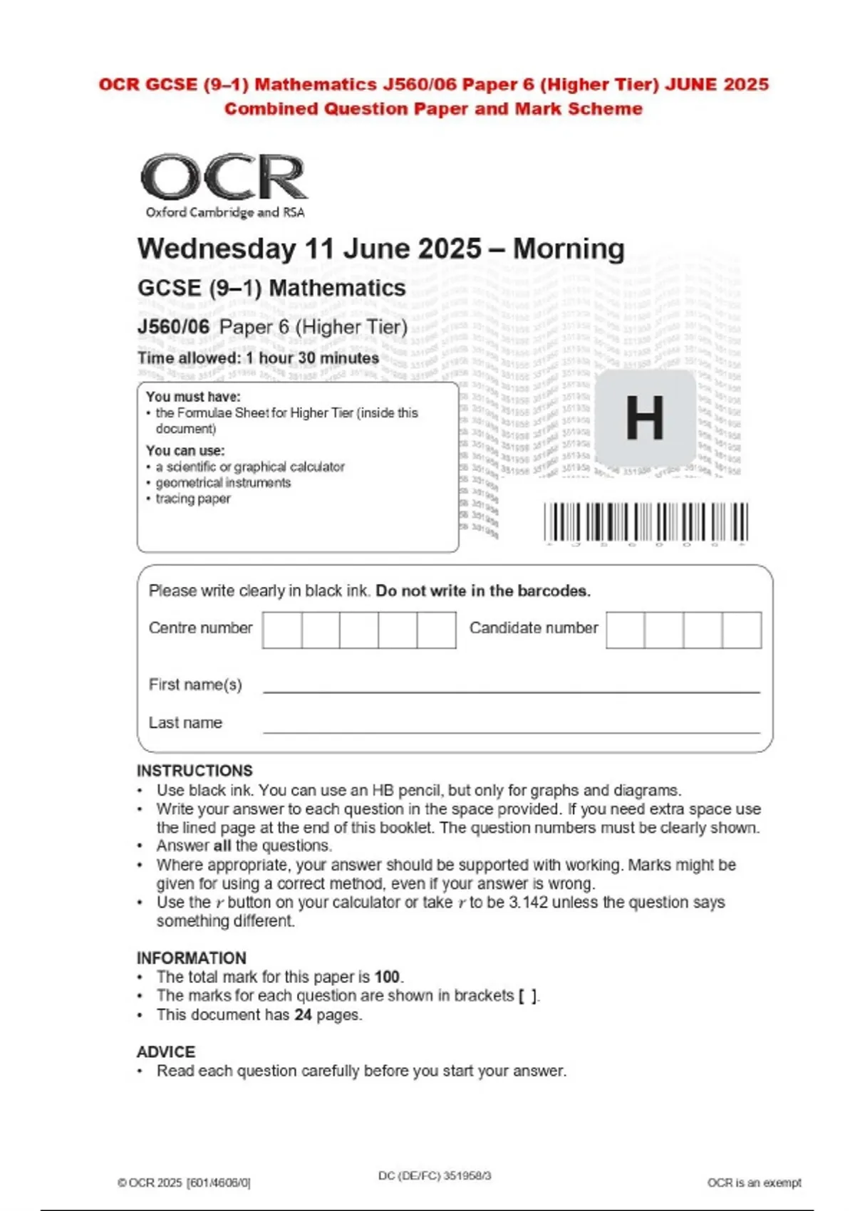 OCR GCSE (9–1) Mathematics J560/06 Paper 6 (Higher Tier) JUNE 2025 Combined Question Paper and Mark Scheme