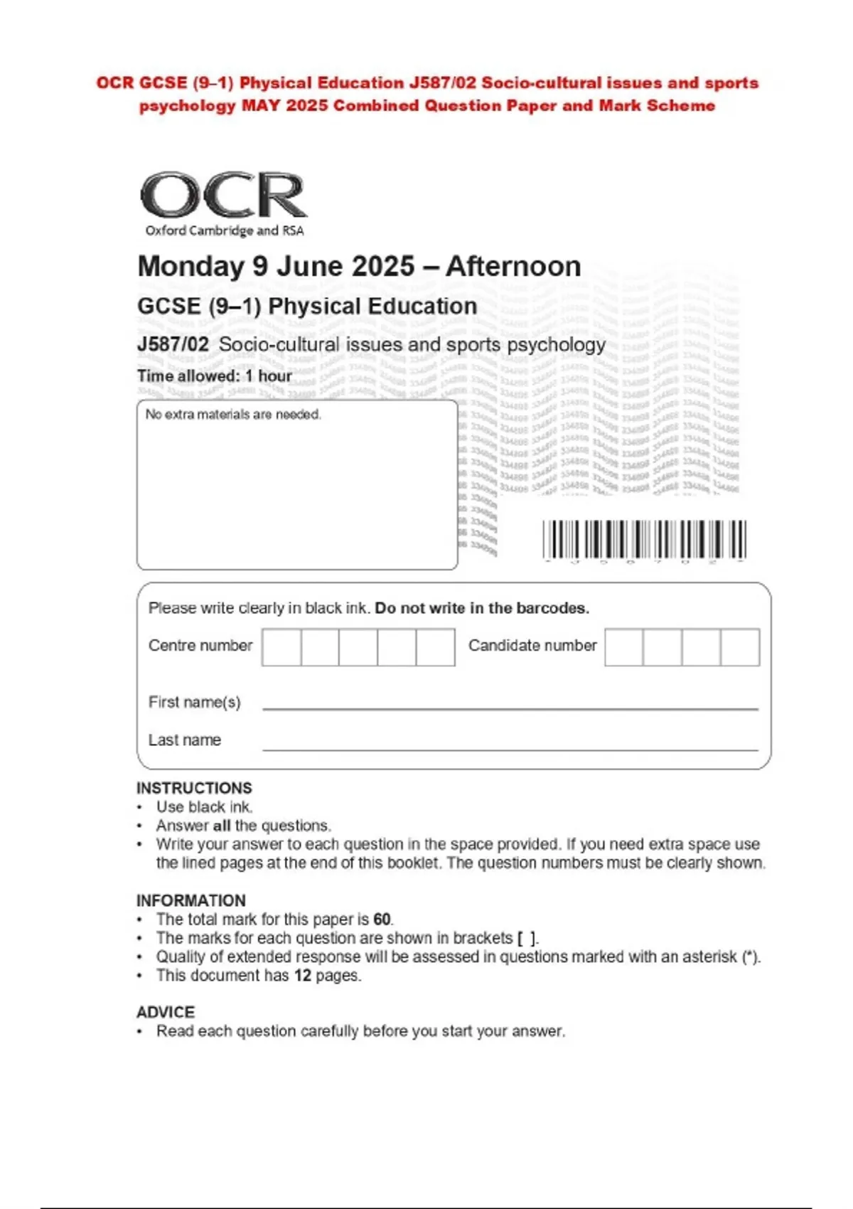 OCR GCSE (9–1) Physical Education J587/02 Socio-cultural issues and sports psychology MAY 2025 Combined Question Paper and Mark Scheme