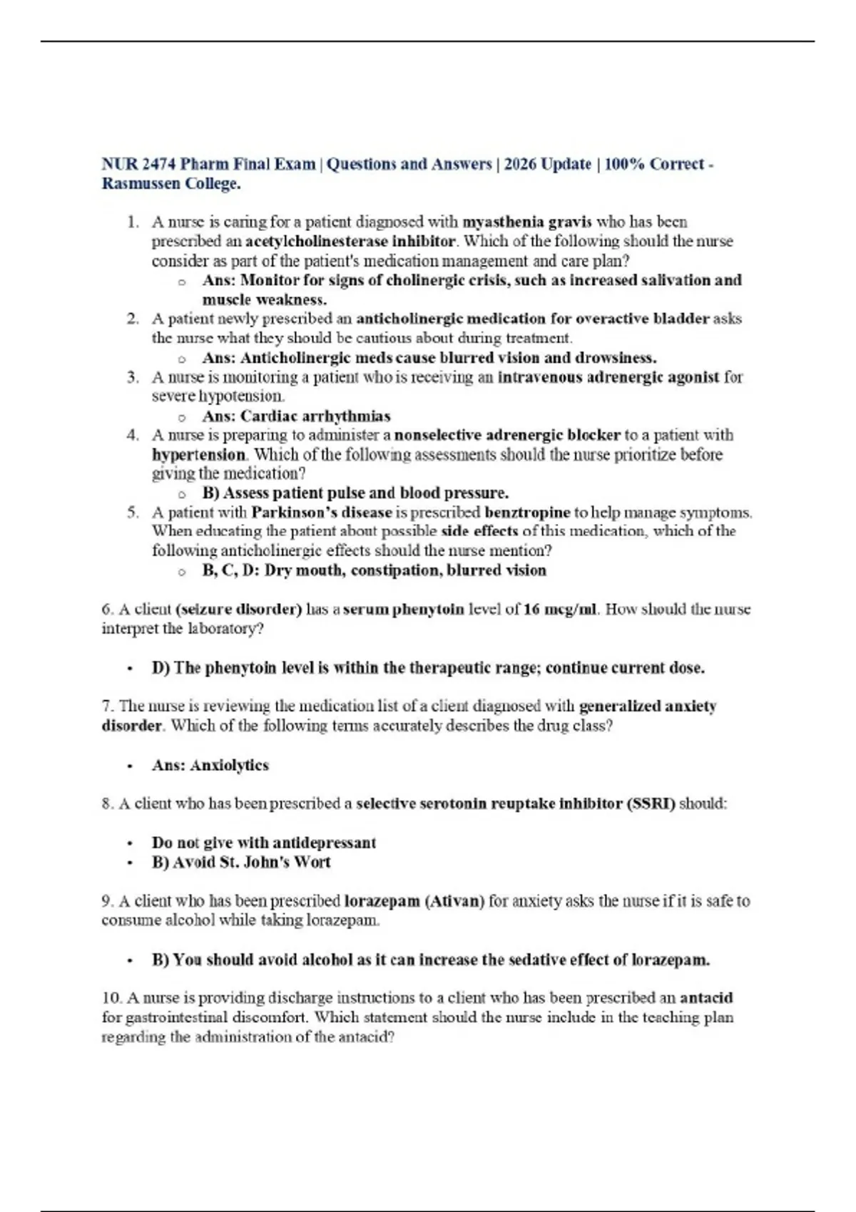 NUR 2474 Pharm Final Exam | Questions and Answers | 2026 Update | 100% Correct - Rasmussen College.