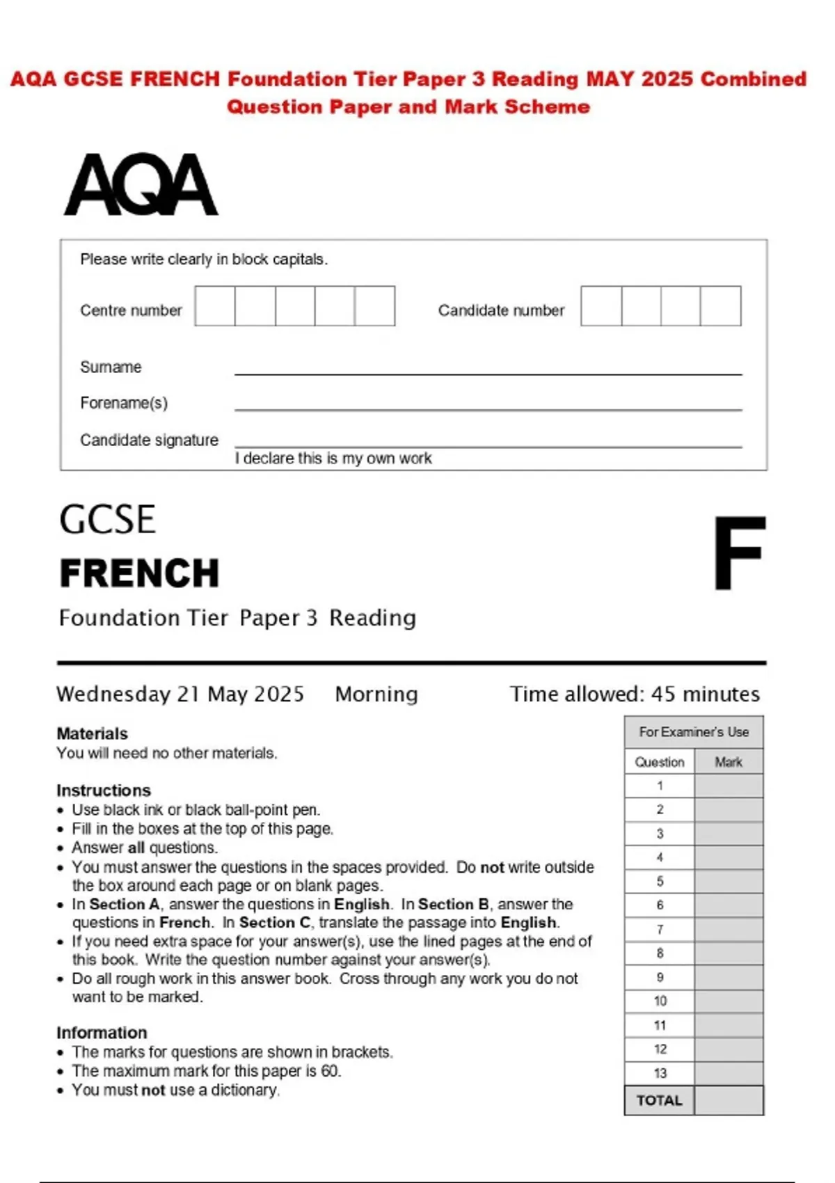 AQA GCSE FRENCH Foundation Tier Paper 3 Reading MAY 2025 Combined Question Paper and Mark Scheme