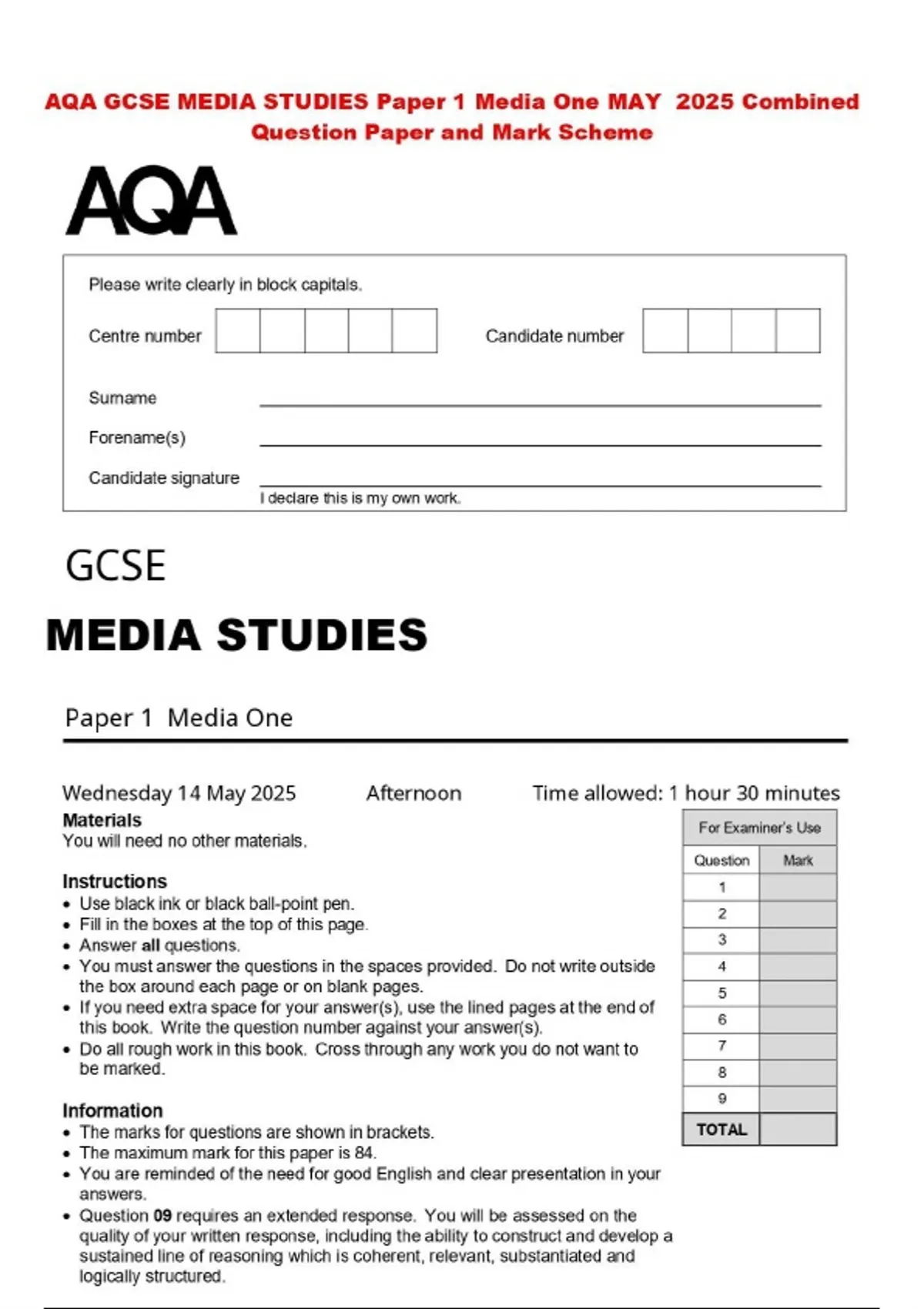 AQA GCSE MEDIA STUDIES Paper 1 Media One MAY 2025 Combined Question Paper and Mark Scheme