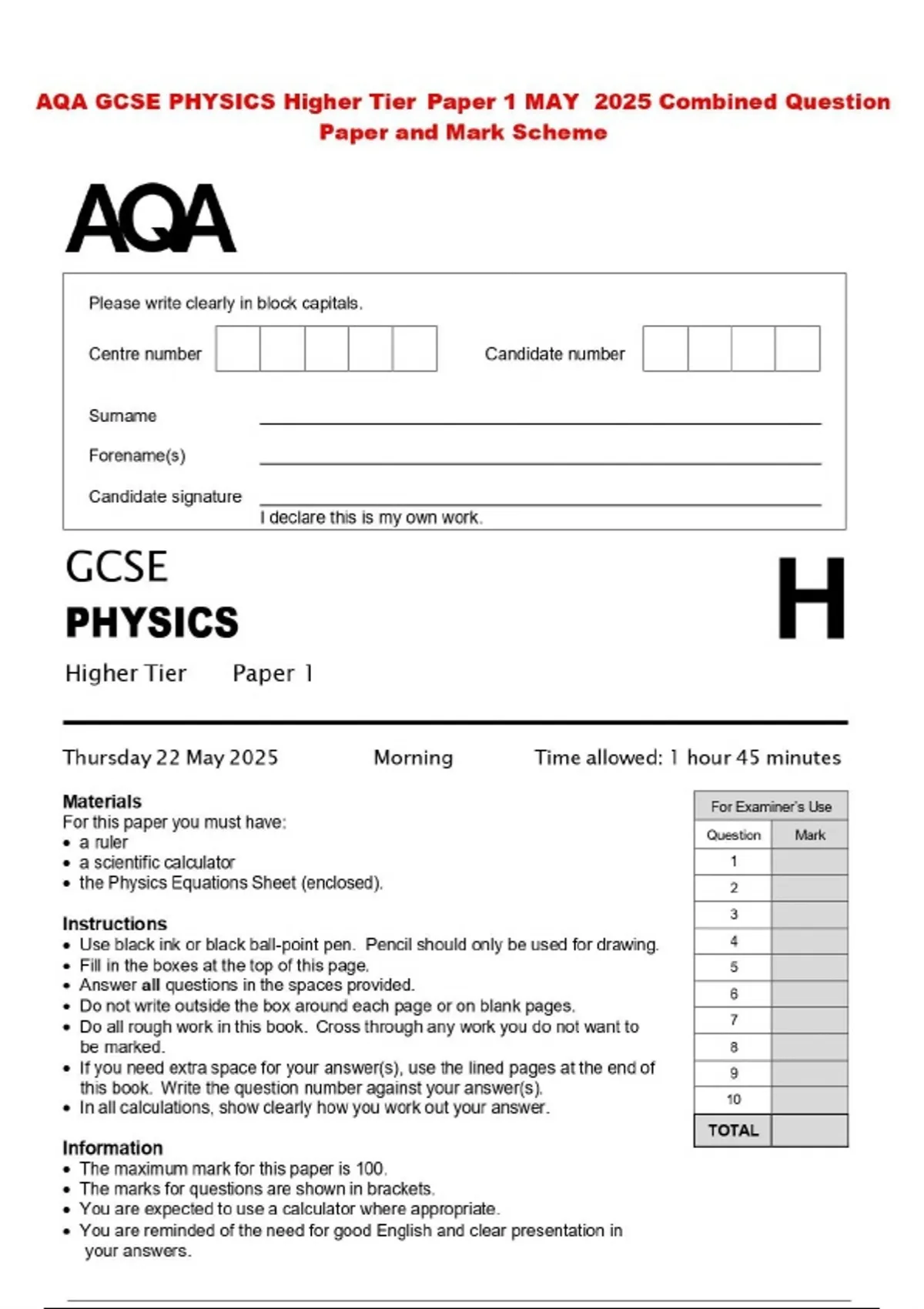 AQA GCSE PHYSICS Higher Tier Paper 1 MAY 2025 Combined Question Paper and Mark Scheme