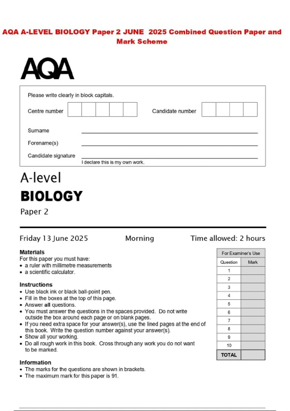 aqa a level biology paper 2 june 2025 combined qu