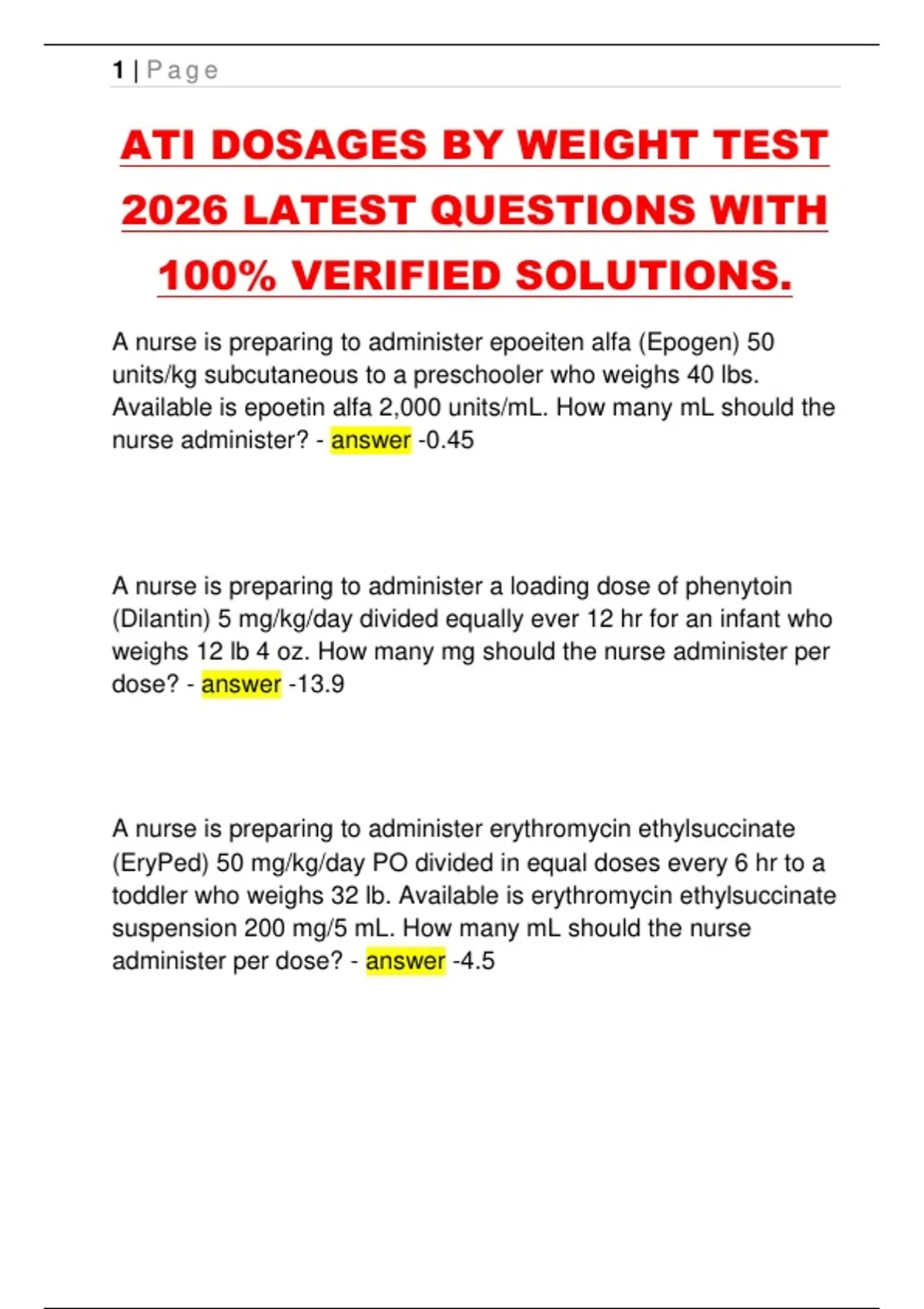 ATI DOSAGES BY WEIGHT TEST 2026 LATEST QUESTIONS WITH 100% VERIFIED SOLUTIONS.