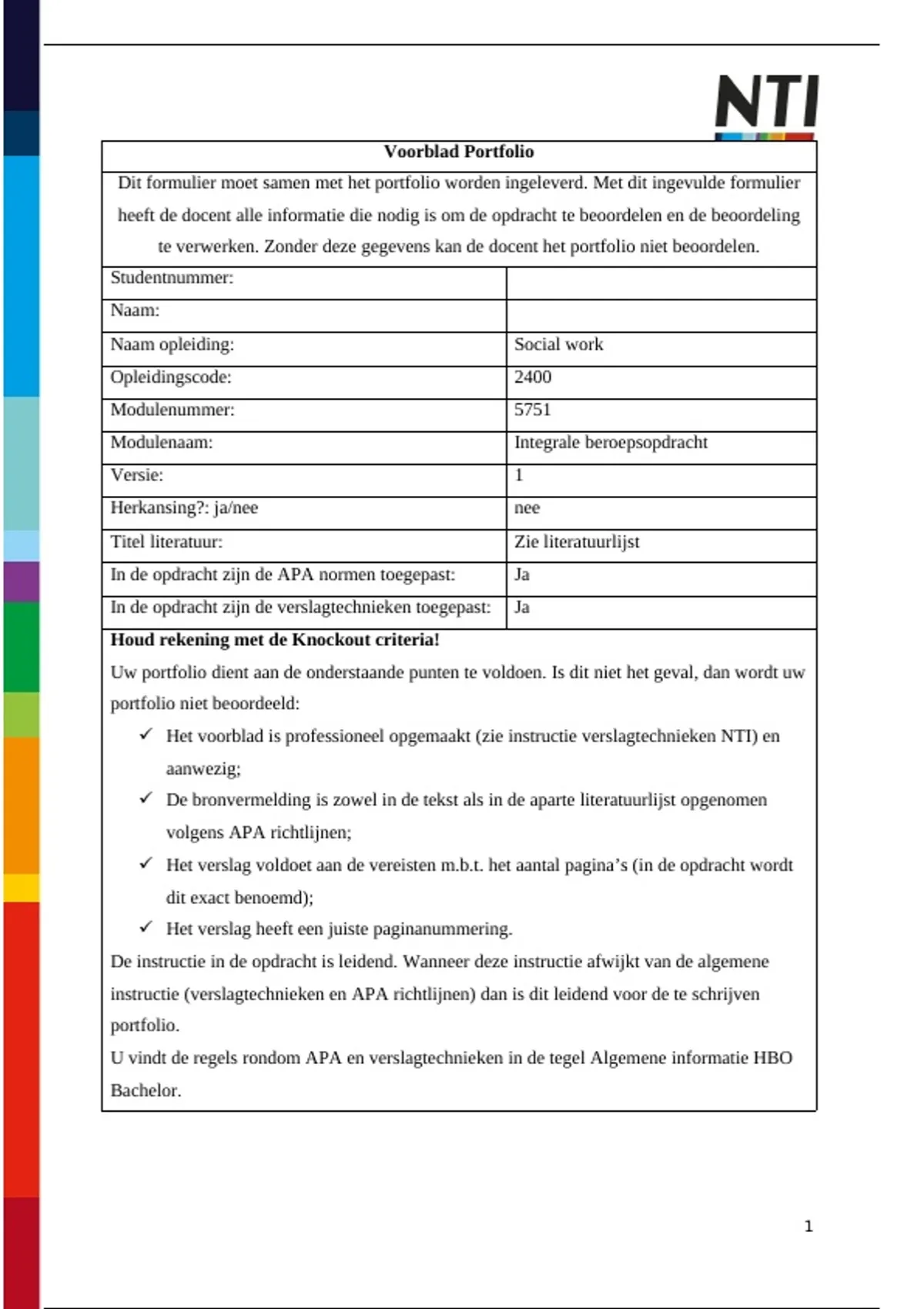 Dit formulier moet samen met het portfolio worden ingeleverd. Met dit ingevulde formulier