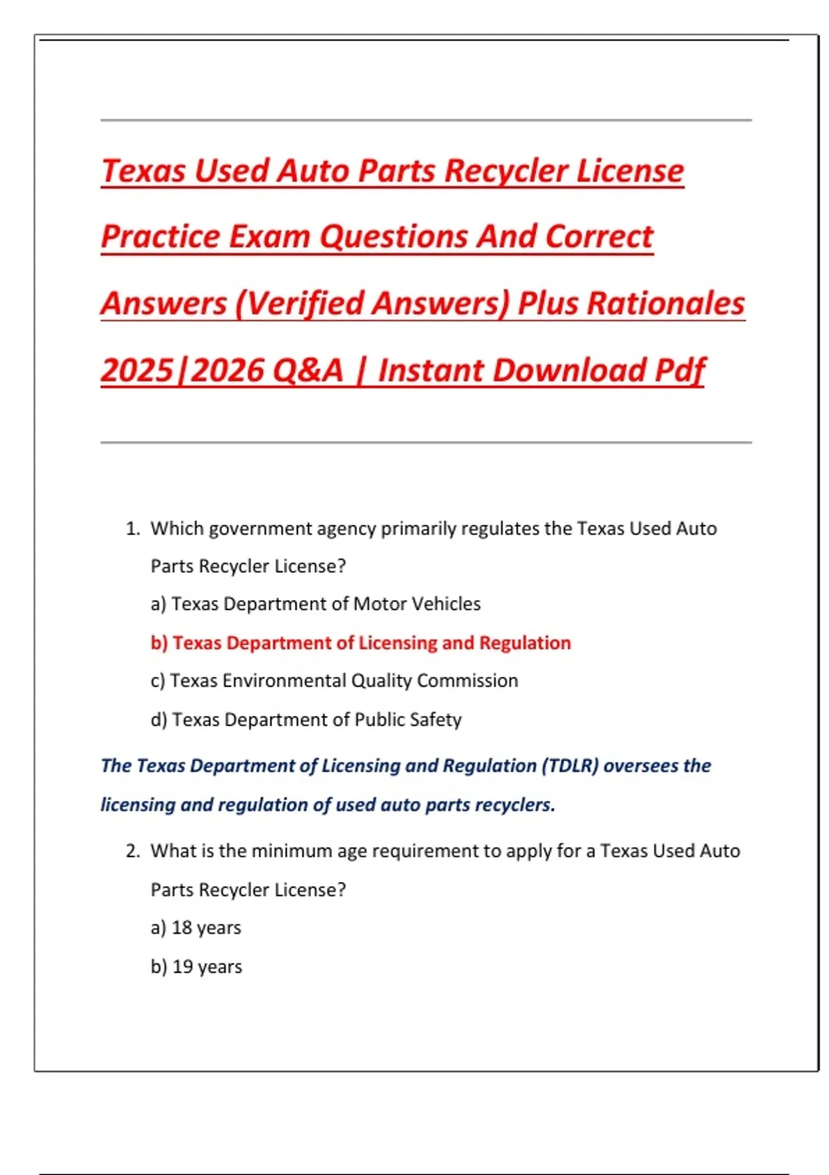 Texas Used Auto Parts Recycler License Practice Exam Questions And Correct Answers (Verified Answers) Plus Rationales 2025|2026 Q&A | Instant Download Pdf