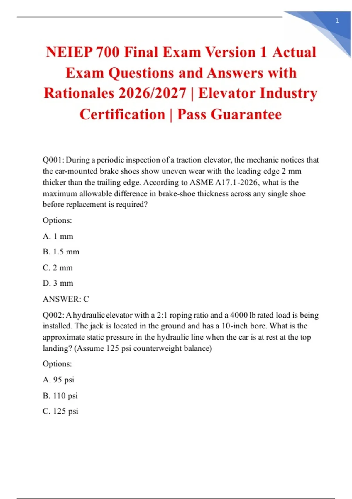 NEIEP 700 Final Exam Version 1 Actual Exam Questions and Answers with Rationales 2026/2027 | Elevator Industry Certification | Pass Guarantee