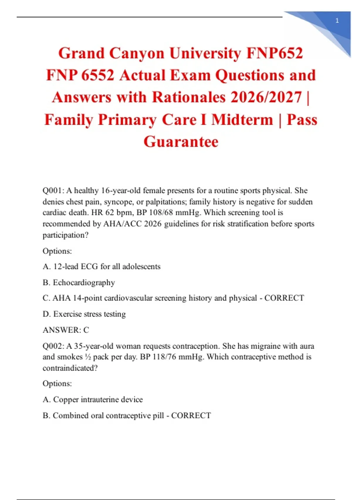 Grand Canyon University FNP652 FNP 6552 Actual Exam Questions and Answers with Rationales 2026/2027 | Family Primary Care I Midterm | Pass Guarantee