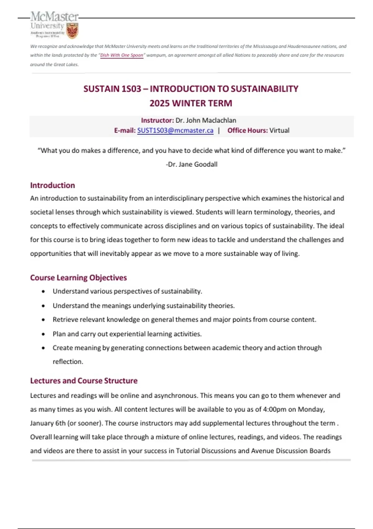 Summary Winter 2025/26 SUSTAIN 1S03 - Course Outline and Learning Objectives: Complete Updated.