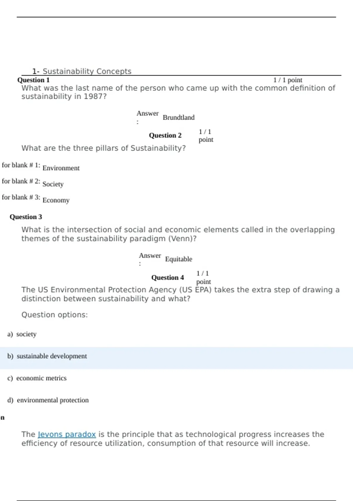 Introduction to Sustainability (Sustain 1S03) - All Quizzes Latest Updated 100% -McMaster. 1- Sustainability Concepts Question 1 1 / 1 point What was the last name of the person who came up with the common definition of sustainability in 1987? Answer : Brundtland Question 2 1 / 1 point What are the three pillars of Sustainability? for blank # 1: Environment for blank # 2: Society for blank # 3: Economy Question 3 1 po What is the intersection of social and economic elements called in the overlapping themes of the sustainability paradigm (Venn)? Answer : Equitable Question 4 1 / 1 point The US Environmental Protection Agency (US EPA) takes the extra step of drawing a distinction between sustainability and what? Question options: a) society b) sustainable development c) economic metrics d) environmental protection on 1 p The Jevons paradox is the principle that as technological progress increases the efficiency of resource utilization, consumption of that resource will increase.Question options: a) True b) False on 1 po The notion that tradeoffs among natural, human, and social capital are not allowed or are very restricted. Question options: a) strong sustainability b) not sustainability c) weak sustainability d) Brundtland's Commission on 1 p The notion where tradeoffs are unrestricted or have few limits. Question options: a) weak sustainability b) strong sustainability c) Not sustainability d) sustainability metrics on 1 p The Brundtland Report makes it clear that while sustainable development is enabled by technological advances and economic viability, it is first and foremost a social construct that seeks to improve the quality of life for the world’s peoples: Question options: a) physically, through the equitable supply of human and ecological goods and servicesb) none of the options c) strategically, through safeguarding the interests of generations to come d) aspirationally, through making available the widespread means for advancement through access to education, systems of j healthcare; on 1 p Sustainable Development is development that meets the needs of the present without compromising the ability of future generations to meet their own needs. Question options: a) True b) False on 1 po What does I in the IPAT equation (I=P×A×T) stand for? Answer : Impact Question 11 1 / 1 point When technological progress increases the efficiency of resource utilization, consumption of that resource will increase. Increased consumption that negates part of the efficiency gains is referred to as over-consumption. Question options: a) True b) False View Feedback Question 12 1 / 1 point An approach that seeks to minimize environmental impacts by maximizing material and energy efficiencies of production. Question options: a) energy savings b) eco-efficiencyc) rebound d) over consumption on 1 p What was the final report of the Brundtland Commission in 1987 called? Question options: a) Our Common Future b) The Sustainability Report c) The Brundtland Journal d) The Agenda on 1 p Activities that are considered sustainable are those that: Question options: a) Have cyclical processes b) Require resources in quantities that could never be available for people everywhere. c) Use renewable resources faster than their rate of renewal. d) Require continual inputs of non-renewable resources. on 1 p Sustainable planning requires consideration of (check all that apply, all or nothing grading): o Question options: a) resource and energy useb) direction of investments c) technological development d) social, political and institutional change 15 / 15 - 100 % Overall 15 / 15 - 100 % Quiz#2-Life Cycle Analysis 0 / 1 point There is a universally accepted standard for the life cycle assessment evaluation method. Question options: Give 1 reasons why Life Cycle Assessments (LCA) is useful despite it's challenges Answer: Quantitative Question 3 1 / 1 point What are the 4 steps of the LCA? Question options:ory analysis, impact assessment, interpretation ory analysis, economic assessment, interpretation analysis, impact assessment, interpretation ory analysis, weighting, impact assessment What body has defined the basic method for the Life Cycle Analysis process? Answer: SETAC and ISO Question 5 1 / 1 point What are the two flows of the Life Cycle? Answer for blank # 1: technical part Answer for blank # 2: societal part Question 6 1 / 1 point Which weighing method discussed in class is based on the distance to a Dutch government policy? Answer : Eco-points Question 7 1 / 1 point What is the main function of a pencil? Answer : writing Question 8 1 / 1 point Life Cycle Assessment is most often used for which of the following: Question options:n What are the five general stages of the product or service chain examined in a life cycle assessment? Question options: processing, utilization, end of life, social impact processing, manufacturing, use, end of life disposal manufacturing, transportation, use, recycling manufacturing, transportation, re-use, end of life disposal What is the appropriate functional unit of measurement for comparing shoes? Question options: arsWould it be practical to compare concrete pavement to paving stones pavement? (Yes or No) Answer: Yes Question 12 1 / 1 point Which of the following is an example of a product that has its highest environmental impact during the end of life phase of its life cycle? Question options: Which of the following is NOT included in LCA Question options: materials duct of LCA Transportation is included as part of the Life Cycle Assessment Question options:What is Life Cycle Assessment? Question options: a) A tool to assess the environmental biocapacity of products, systems, or services at all stages in their life cycle b) A tool to assess the potential environmental impacts of products, systems, or services at all stages in their life c c) A tool to assess the potential environmental risk of products, systems, or services in the stage of their disposal d) A tool to as