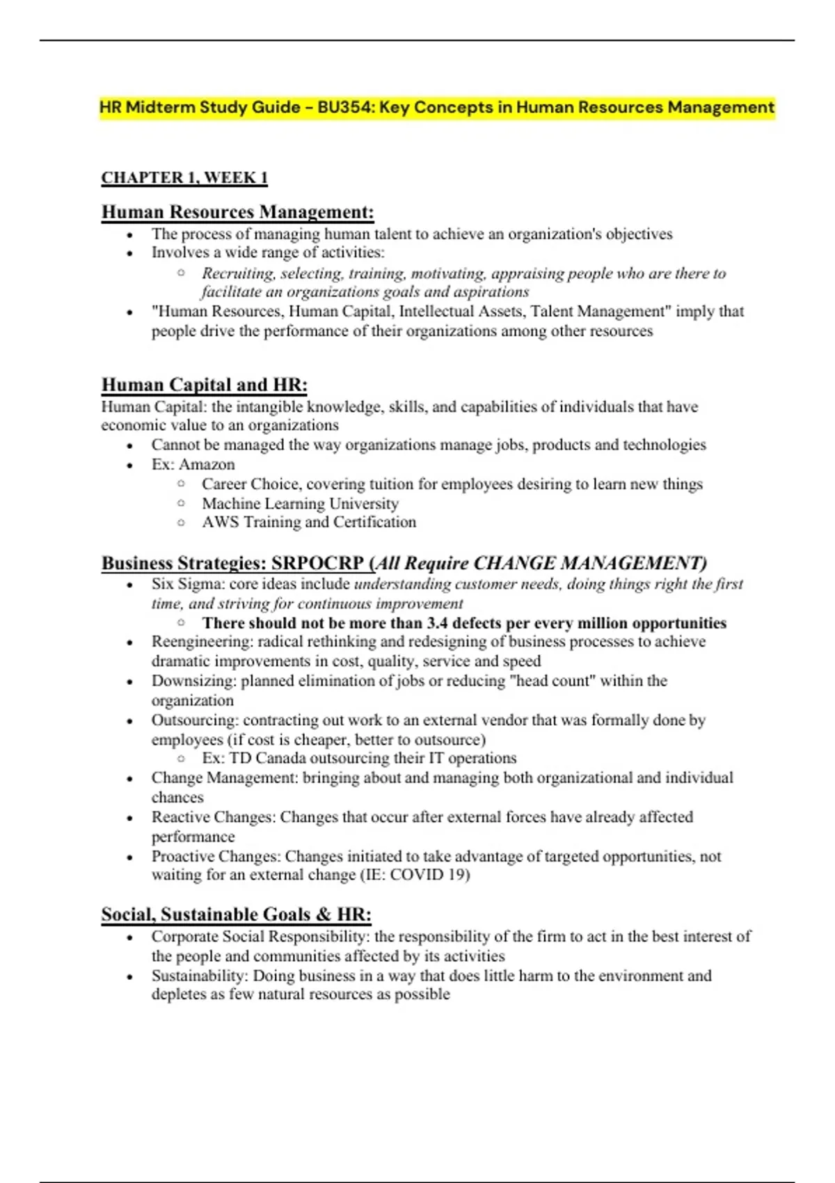 Summary HR Midterm Study Guide - BU354: Key Concepts in Human Resources Management | Latest Fall 2025/26 A+ Guide - Wilfrid Laurier University.