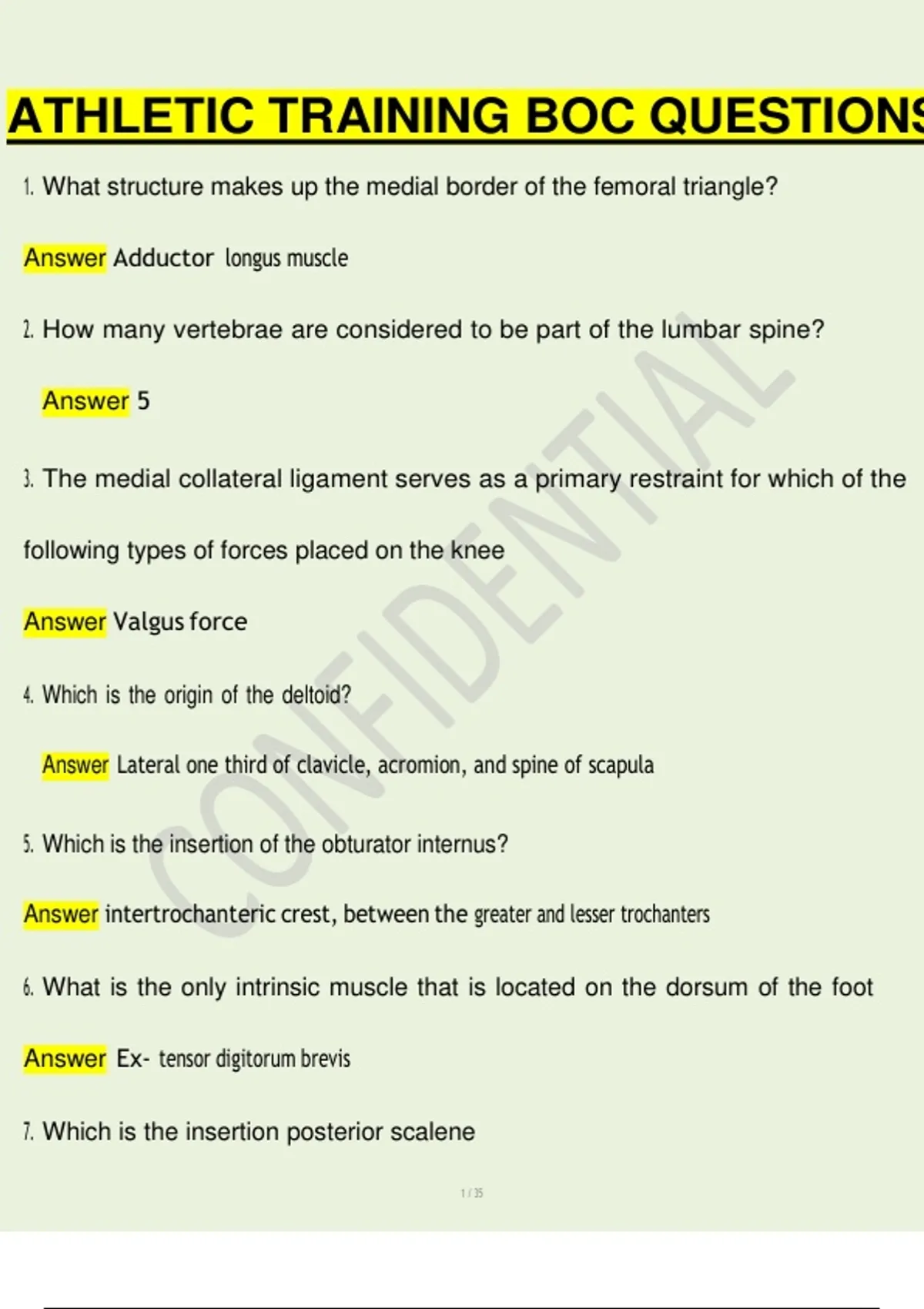 This document is a comprehensive question-and-answer study guide for the Athletic Training Board of Certification (BOC) exam, covering a wide range of clinical, emergency care, rehabilitation, and professional practice topics. It includes detailed questions with correct answers on anatomy, biomechanics, orthopedic injuries, special tests, emergency procedures, therapeutic modalities, rehabilitation principles, nutrition, pathology, pharmacology, and professional responsibility. Designed for athletic training students and BOC exam candidates, this resource is ideal for final exam preparation, certification review, and last-minute studying. The questions closely reflect real BOC exam content and clinical decision-making scenarios, making this guide a high-value tool for improving exam readiness and confidence.