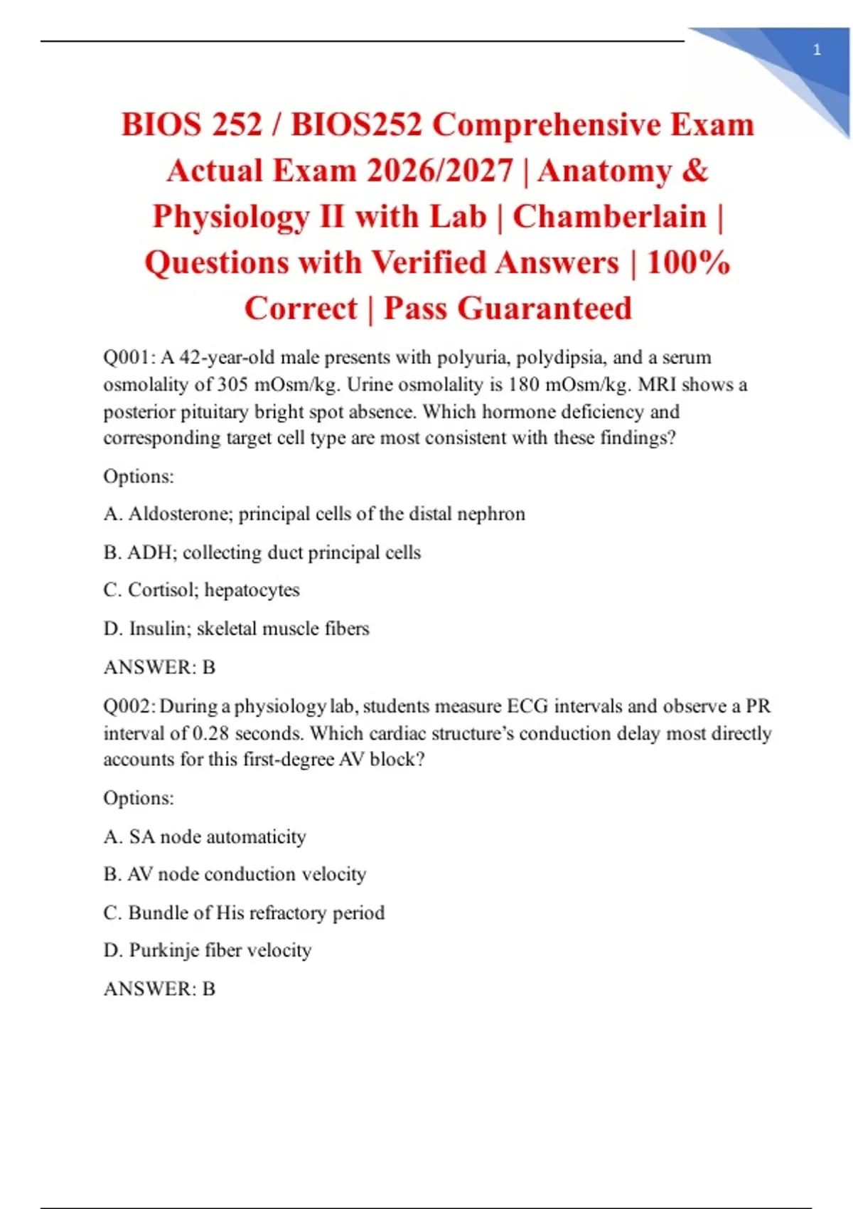 BIOS 252 / BIOS252 Comprehensive Exam Actual Exam 2026/2027 | Anatomy & Physiology II with Lab | Chamberlain | Questions with Verified Answers | 100% Correct | Pass Guaranteed PERFECT SEO DESCRIPTION: BIOS 252 / BIOS252 COMPREHENSIVE EXAM ACTUAL EXAM 2026/2027 | ANATOMY & PHYSIOLOGY II WITH LAB | CHAMBERLAIN | PASS GUARANTEED Prepare with the actual Chamberlain University Comprehensive Exam - Pass Guaranteed! This resource contains actual exam questions and verified answers for the 2026/2027 BIOS 252 / BIOS252 Anatomy & Physiology II with Lab Comprehensive Exam. Guaranteed to help you pass or your money back. WHAT'S INCLUDED: • Actual Comprehensive Exam Questions from BIOS 252 • 100% Verified Answers with anatomy rationales • Complete Course Content tested on the actual exam • Lab & Lecture Material from the real test • 85-Page Professional PDF – Instant digital download • PASS GUARANTEE – Confidence in your success KEY FEATURES: • Actual Exam Content – Real BIOS 252 comprehensive questions • Pass Guarantee – Your success assured • Time-Saving – Study exactly what's on the exam • Score Improvement – Know the actual exam format • Updated for 2026/2027 – Current Chamberlain curriculum ACTUAL EXAM TOPICS: Complete Anatomy Review – Actual exam questions Physiology Systems – Real test scenarios Laboratory Applications – Comprehensive content Integrated Concepts – Application questions DETAILS: Course: BIOS 252 / BIOS252 Anatomy & Physiology II with Lab University: Chamberlain University Exam: Actual Comprehensive Examination Year: 2026/2027 Format: PDF (Printable, Searchable) Delivery: Instant Download Guarantee: Pass Guaranteed