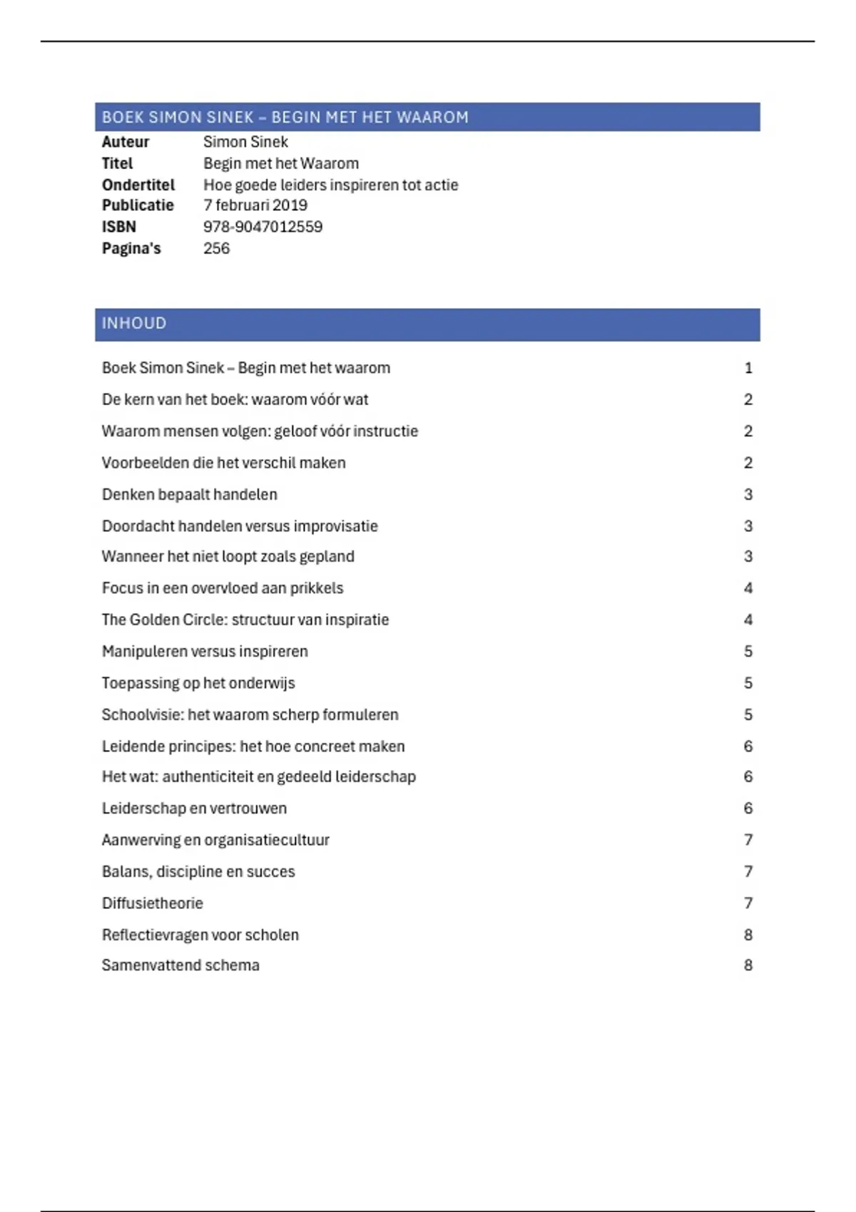 Deze samenvatting geeft een helder en samenhangend overzicht van de kernideeën uit Begin met het Waarom van Simon Sinek. De centrale gedachte — starten bij waarom in plaats van wat — wordt duidelijk uitgelegd en logisch opgebouwd. Inhoudelijk focust de tekst op: het WHY–HOW–WHAT-denkkader inspirerend leiderschap en vertrouwen lange-termijnsucces en organisatiecultuur De samenvatting bevat daarnaast een aanvullende vertaalslag naar het onderwijs, zonder afbreuk te doen aan de bredere toepasbaarheid van Sineks inzichten. Geschikt als studiemateriaal of overzicht bij het bestuderen van dit boek.