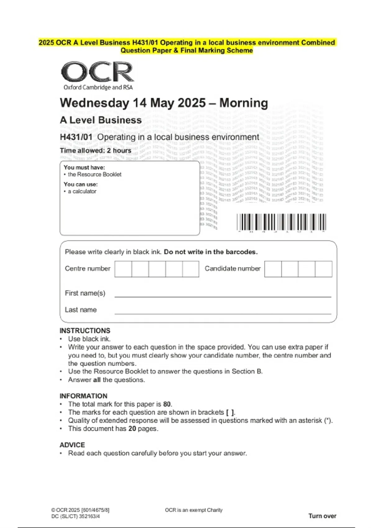 2025 OCR A Level Business H431/01 Operating in a local business environment Question Paper & Marking Scheme