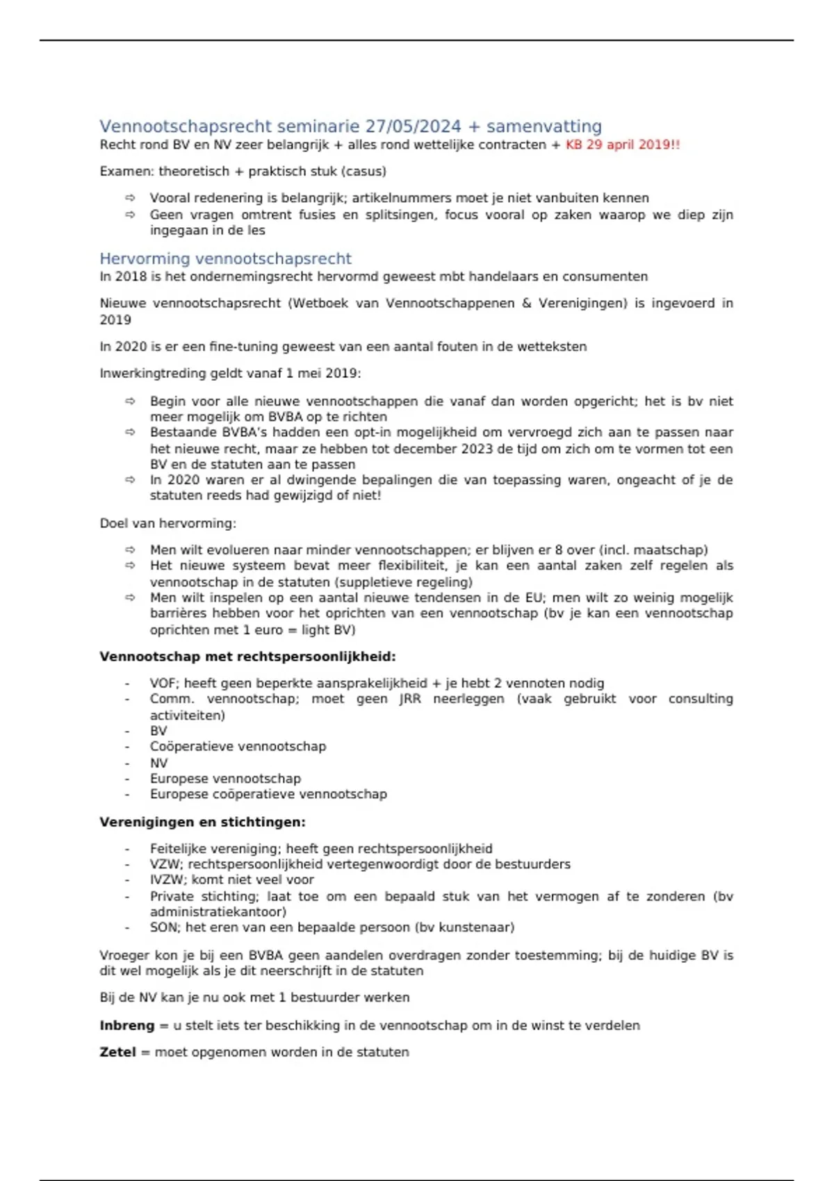Vennootschapsrecht seminarie 27/05/2024 + samenvatting