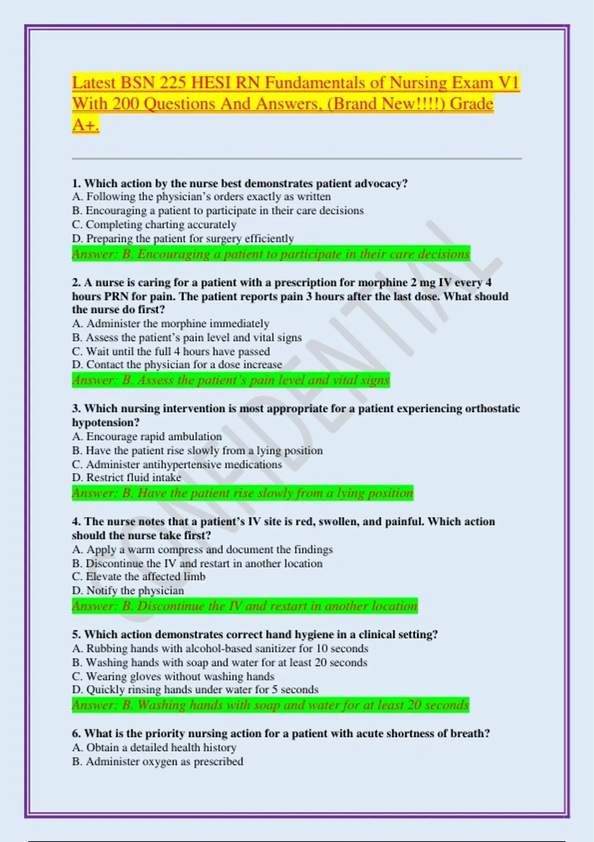 Latest BSN 225 HESI RN Fundamentals of Nursing Exam V1