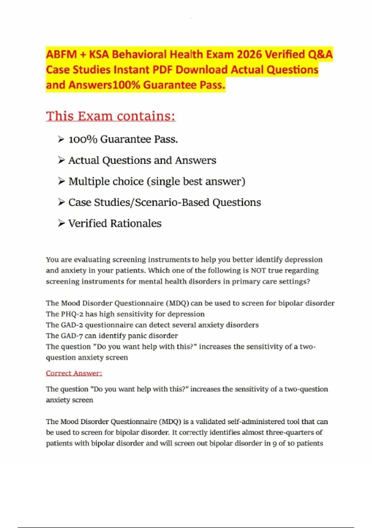 ABFM + KSA Behavioral Health Exam 2026 Verified Q&A Case Studies Instant PDF Download Actual Questions and Answers100% Guarantee Pass.ABFM + KSA Behavioral Health Exam 2026 Verified Q&A Case Studies Instant PDF Download Actual Questions and Answers100% Guarantee Pass.Ace the ABFM + KSA Behavioral Health Certification Exam with this updated 2026 reviewer. Includes actual questions, multiple-choice answers, case studies, and verified rationales. Covers depression and anxiety screening tools, insomnia management, antidepressant monitoring, suicide risk, and relapse prevention. Instant PDF download ensures fast access to trusted prep materials widely used in family medicine and psychiatry programs. Perfect for board review and guaranteed exam successABFM Exam, KSA Behavioral Health, Behavioral Health Certification Exam, Verified Q&A, Case Studies, Family Medicine Board Prep, Depression Screening, Anxiety Screening, PHQ-9, GAD-7, Insomnia Management, Doxepin Therapy, Antidepressant Monitoring, Suicide Risk, Relapse Prevention, Instant PDF Download, Medical Exam Prep, Docsity Study Guide, Exam Prep Bundle, Verified Study Material, Board Certification Exam, Behavioral Health Final Exam