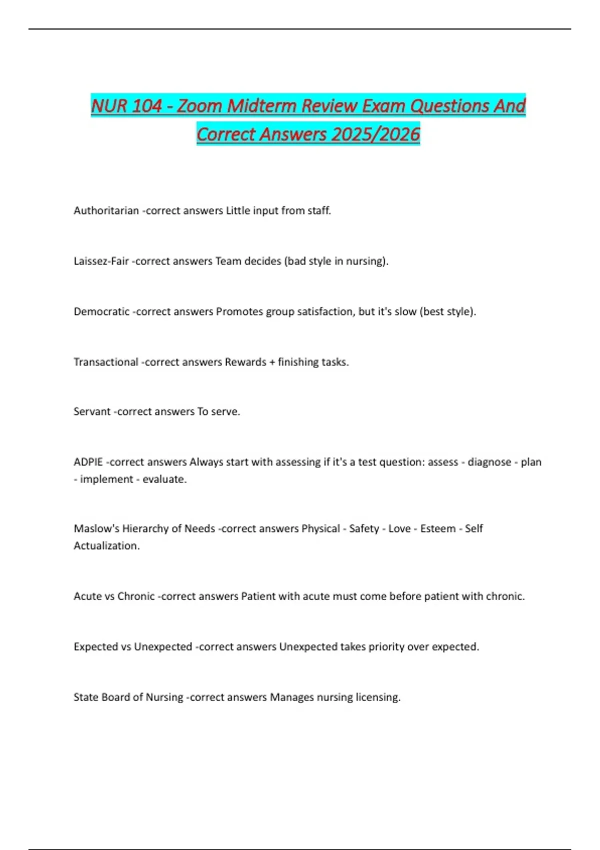 Laissez-Fair -correct answers Team decides (bad style in nursing).