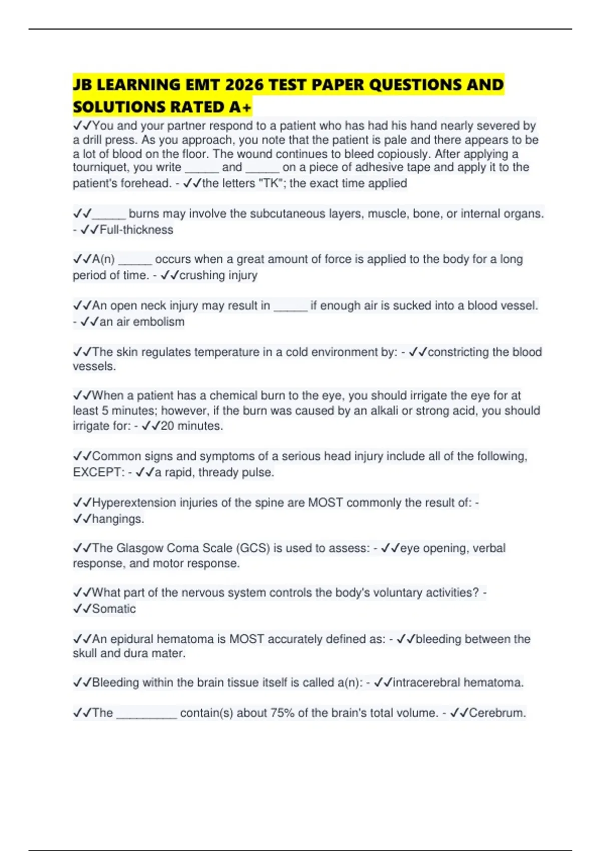 JB LEARNING EMT 2026 TEST PAPER QUESTIONS AND SOLUTIONS RATED A+