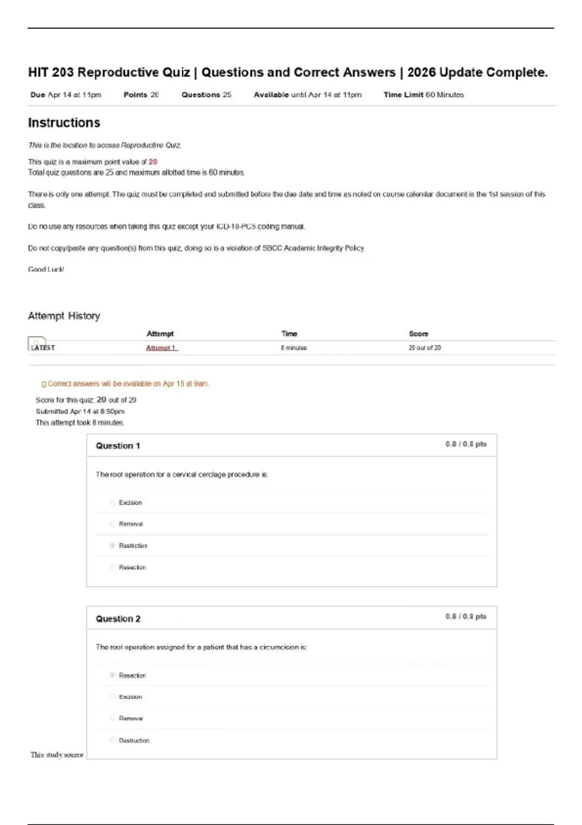 HIT 203 Reproductive Quiz | Questions and Correct Answers | 2026 Update Complete.