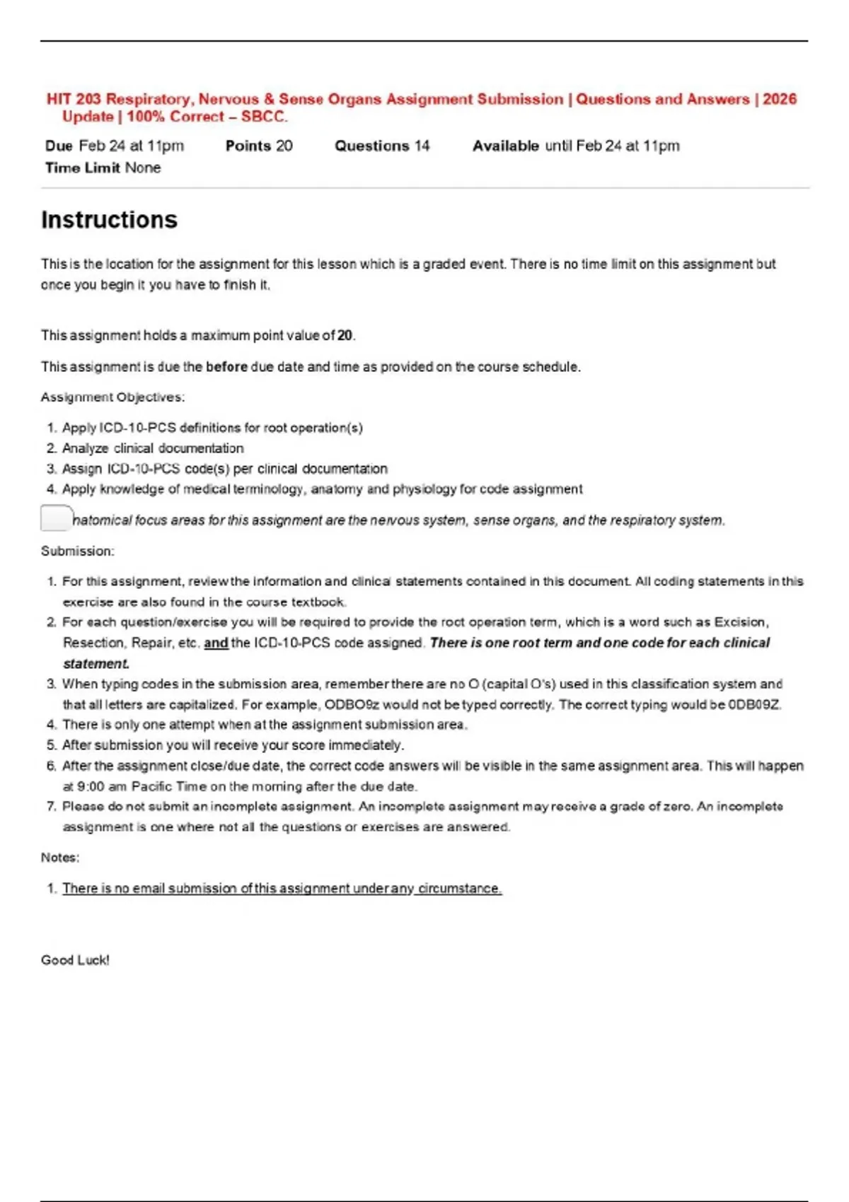 HIT 203 Respiratory, Nervous & Sense Organs Assignment Submission | Questions and Answers | 2026 Update | 100% Correct – SBCC.