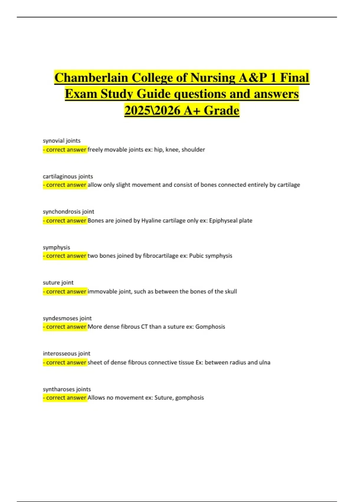 The A&P I Final Exam at Chamberlain College of Nursing assesses foundational knowledge of human anatomy and physiology. The 2025/2026 study guides provide verified questions and answers, graded A+, covering all major body systems and core concepts.