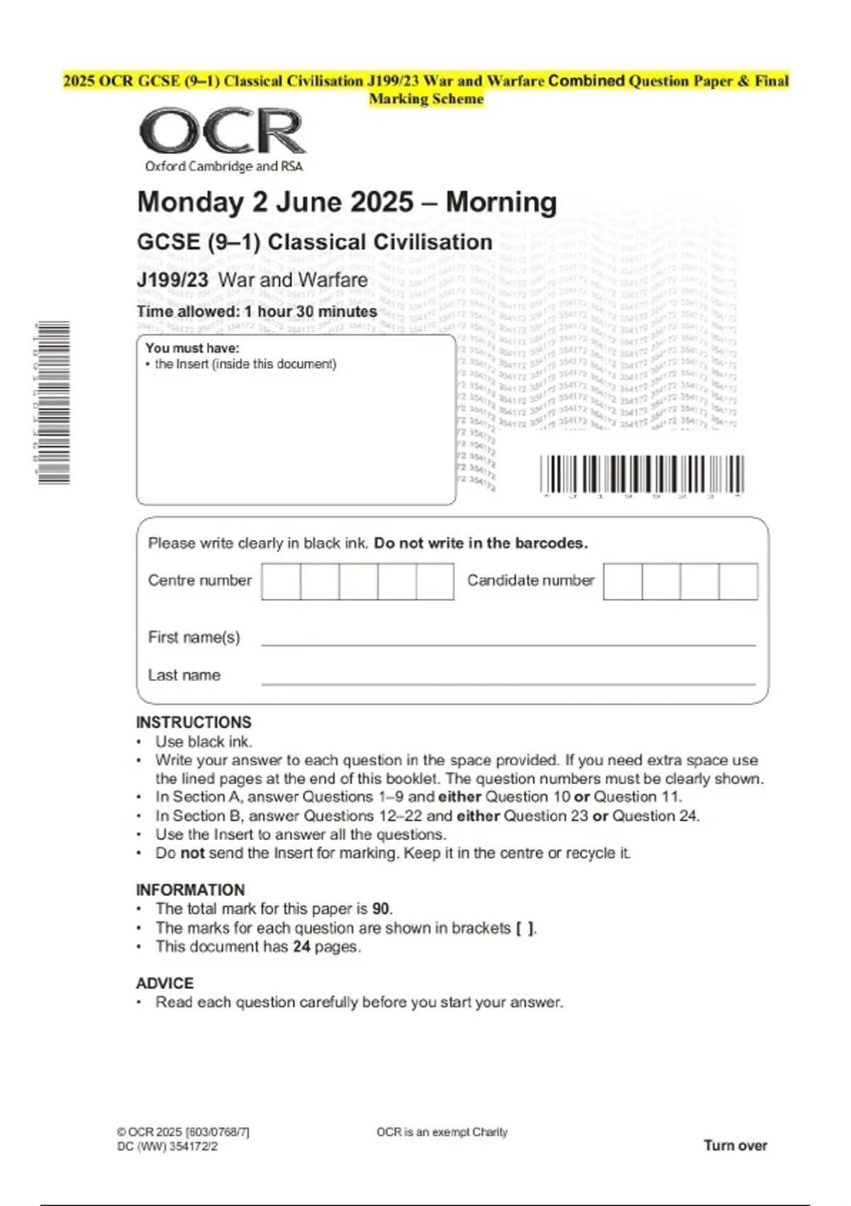 2025 OCR GCSE (9–1) Classical Civilisation J199/23 War and Warfare Examination Paper and Final Marking Scheme