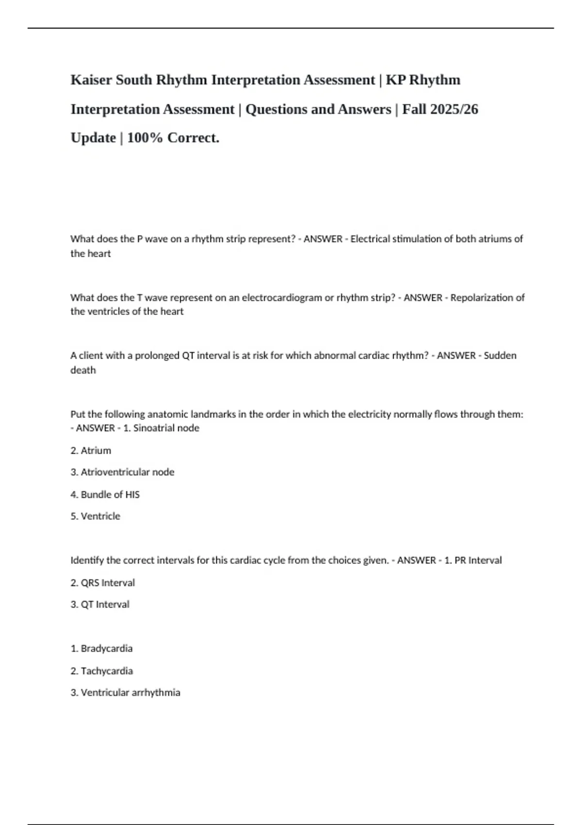 A client with a prolonged QT interval is at risk for which abnormal cardiac rhythm? - ANSWER - Sudden