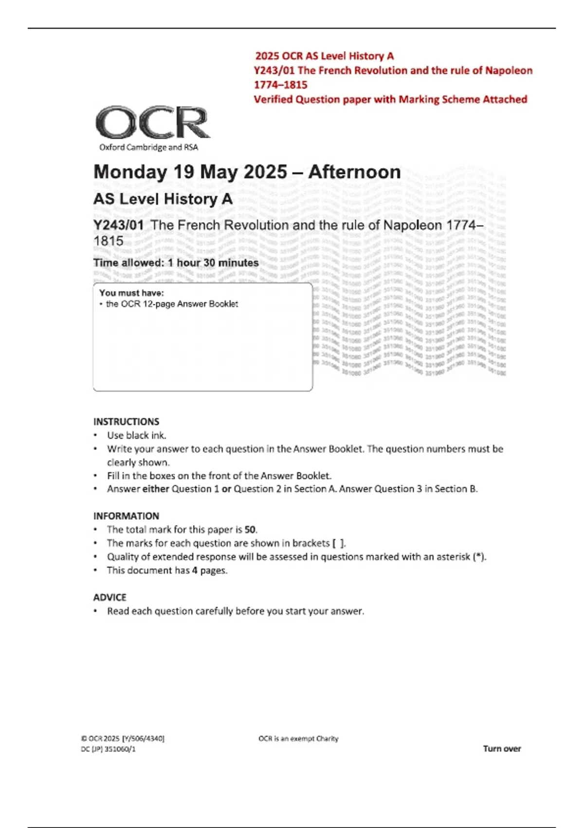 Prepare for OCR AS Level 2025 History A with this official Y243/01 question paper on The French Revolution and the Rule of Napoleon 1774–1815. Includes detailed marking scheme, fully worked answers, comprehensive topic coverage, and strategies for achieving top marks. Perfect for structured revision, exam preparation, and academic excellence.