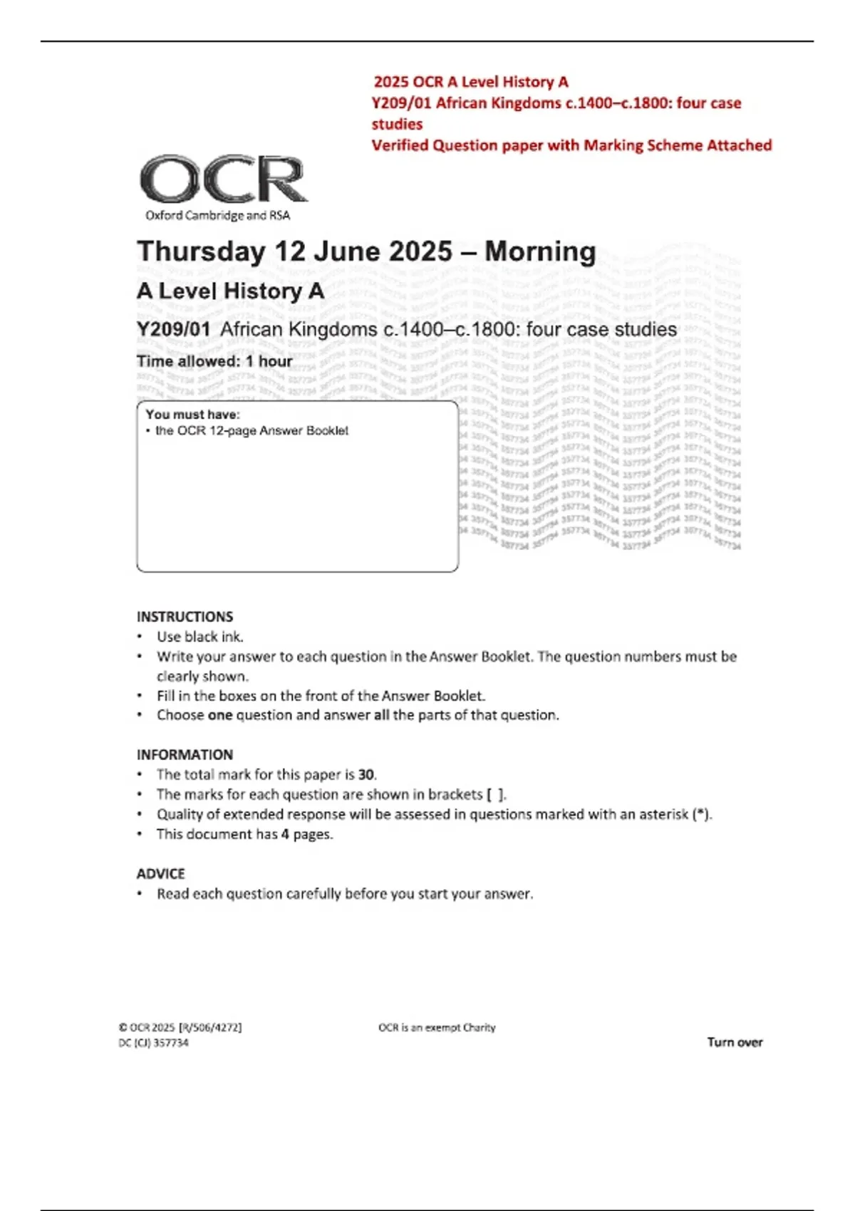 OCR A Level 2025 History A Y209/01 African Kingdoms c.1400–c.1800: Four Case Studies Question Paper | Official with Marking Scheme & Fully Worked Answers