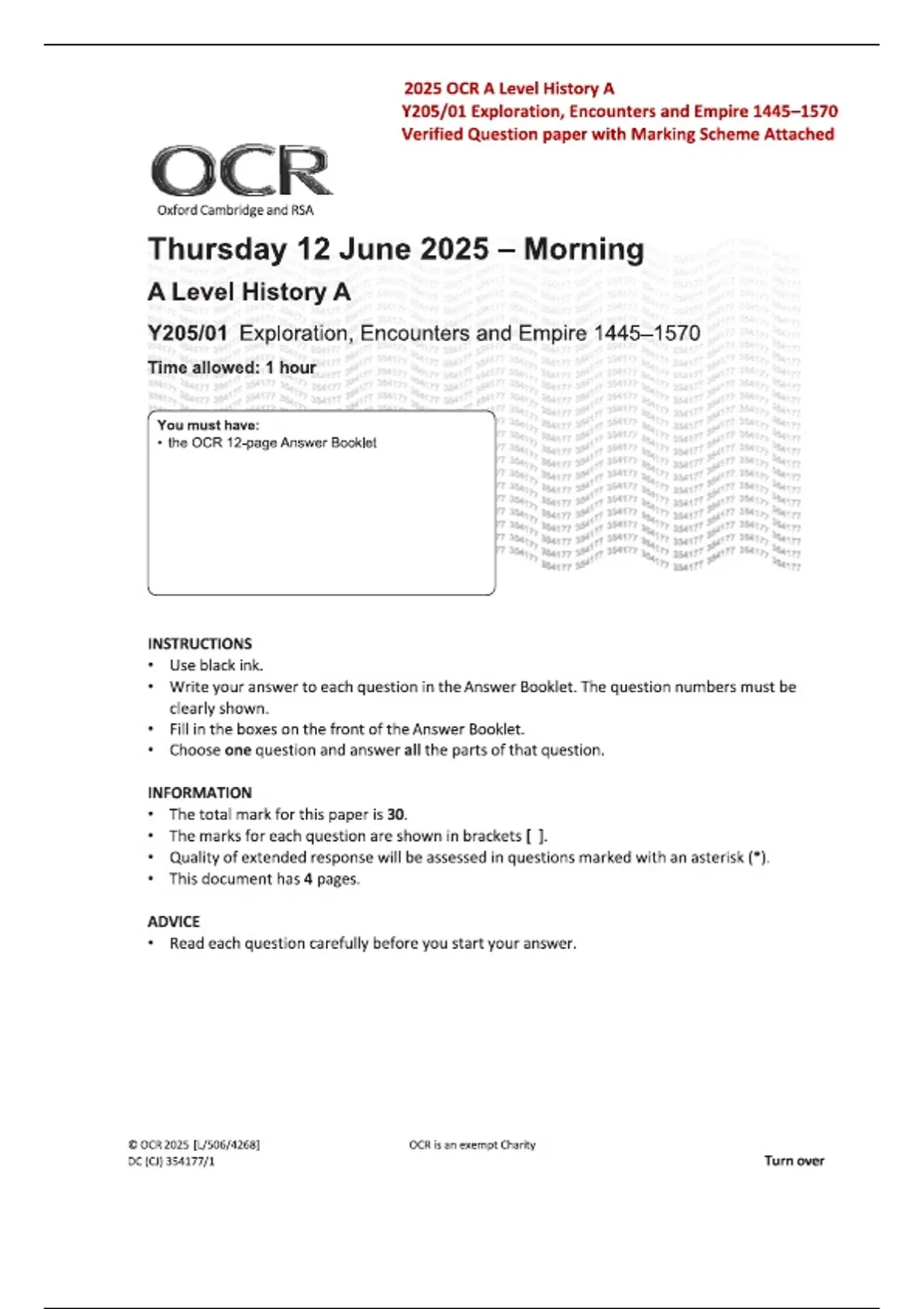 Prepare for OCR A Level 2025 History A with this official Y205/01 Exploration, Encounters and Empire 1445–1570 question paper. Includes detailed marking scheme, fully worked answers, comprehensive topic coverage, and strategies for achieving top marks. Perfect for structured revision, exam preparation, and academic excellence.