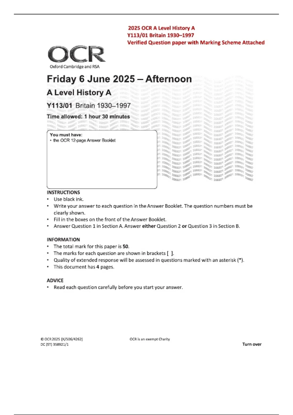 OCR A Level 2025 History A Y113/01 Britain 1930–1997 Question Paper | Official with Marking Scheme & Fully Worked Answers