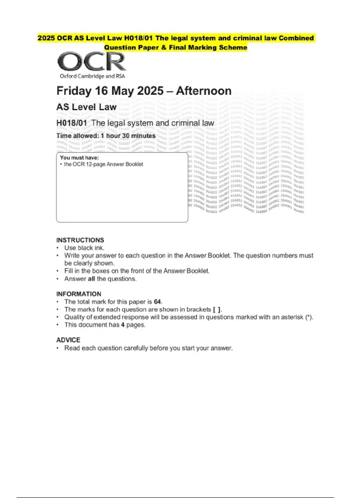 2025 OCR AS Level Law H018/01 The legal system and criminal law Combined Question Paper and Marking Scheme