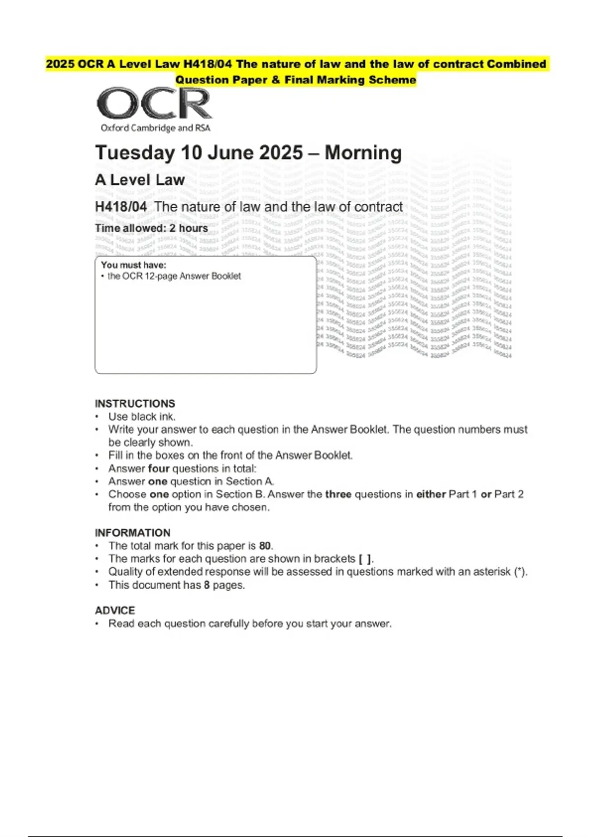 2025 OCR A Level Law H418/04 The nature of law and the law of contract Combined Question Paper and Marking Scheme